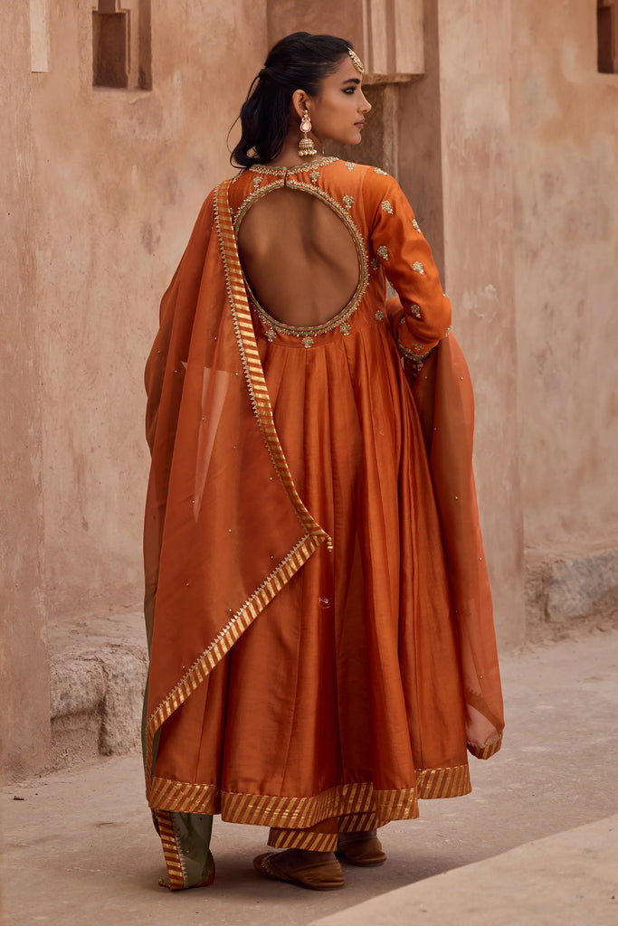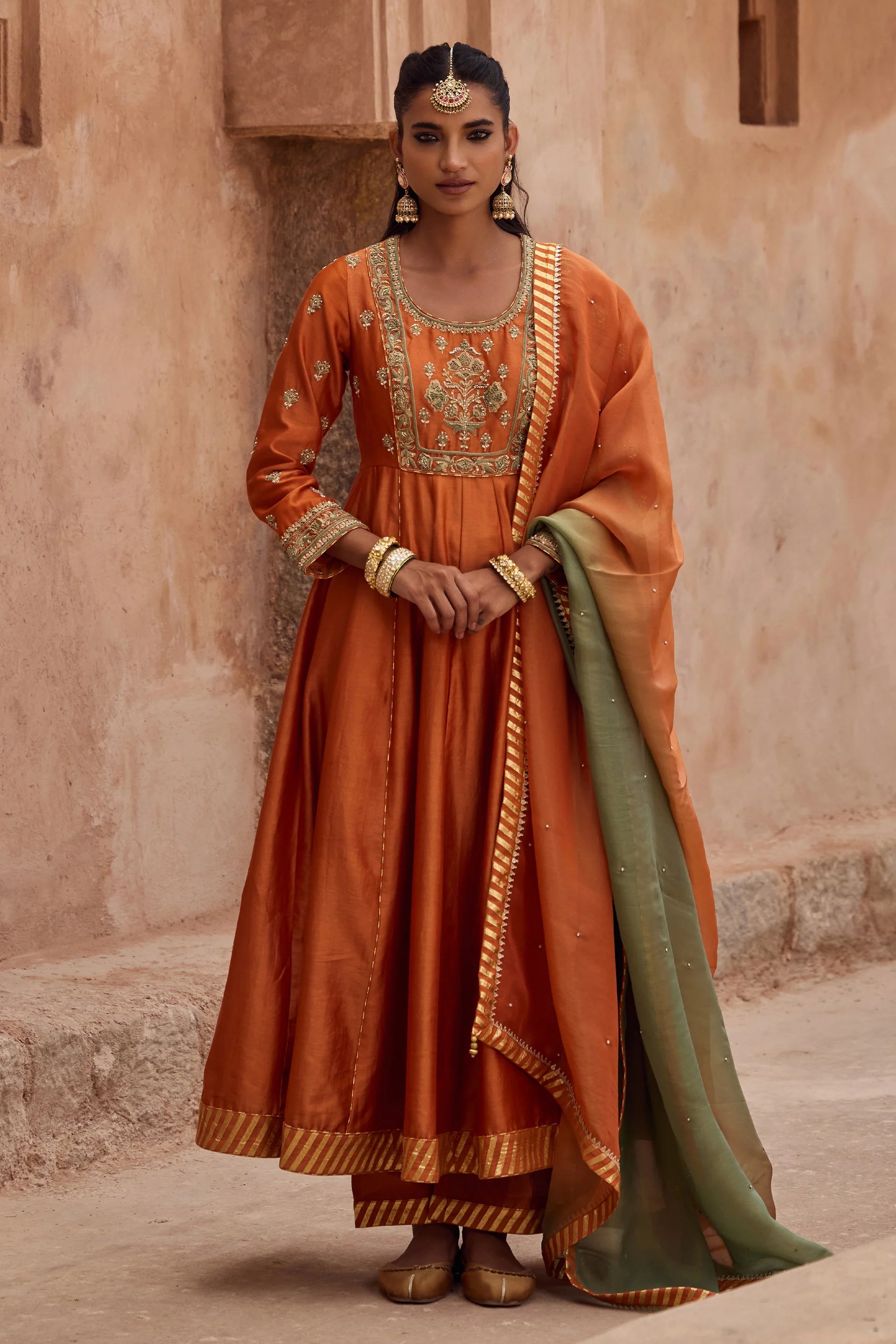 Featuring a Rust Dori Hand Embroidered Anarkali Paired With a Pant and a Tissue Ombre Dupatta . the Beautiful Mix of Colors in Embroidery Makes it a Perfect Ensemble for Wedding Festivities.