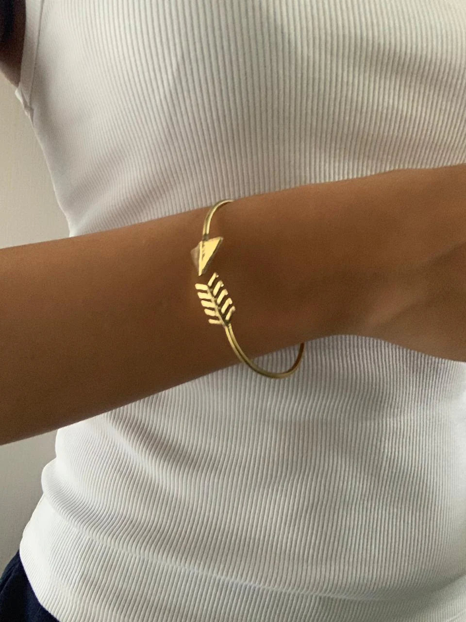 The Arrow cuff bracelet is made with high quality materials, it features a sleek arrow design that exudes elegance and modernity. It is a stylish and versatile accessory that adds a touch of sophistication to any outfit.