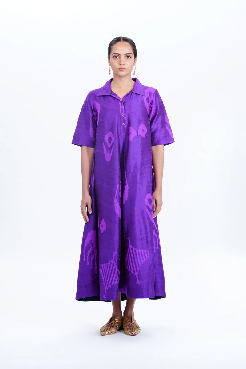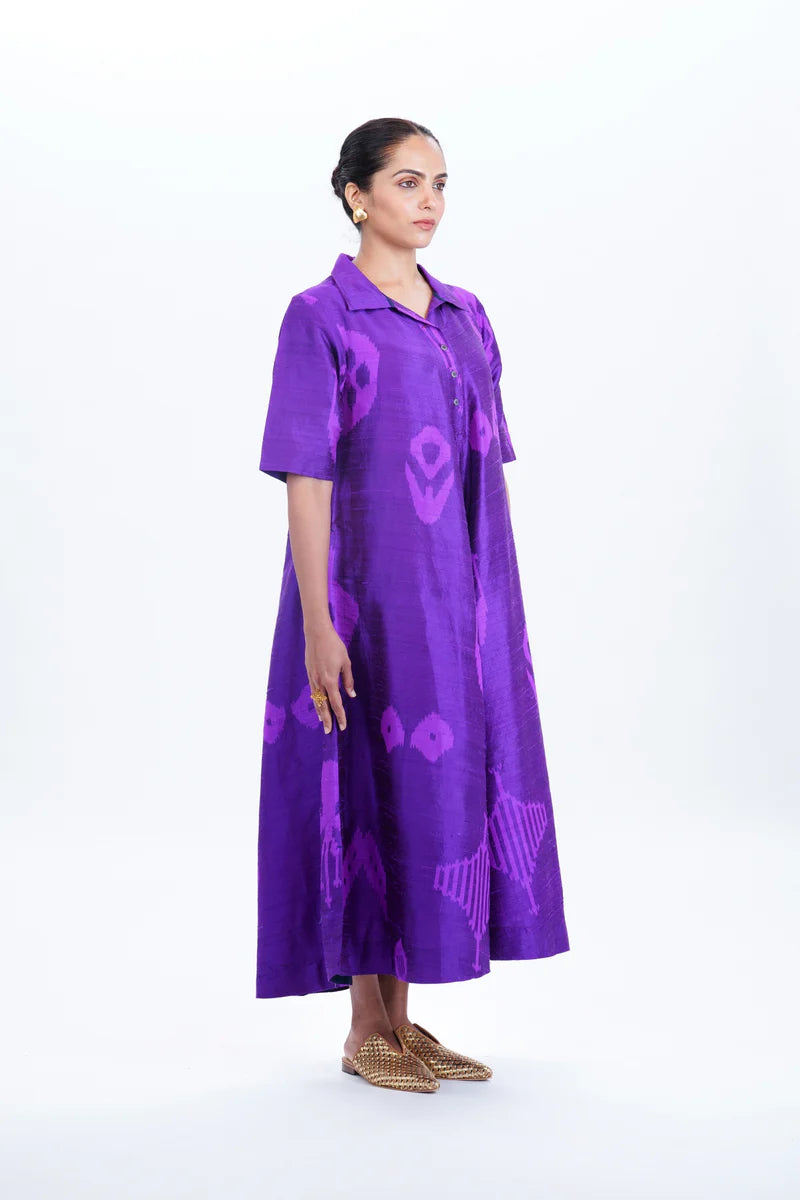 This maxi features a collared neckline with a half-placket opening, half sleeves, and convenient inseam pockets on both sides—offering effortless style and ease.