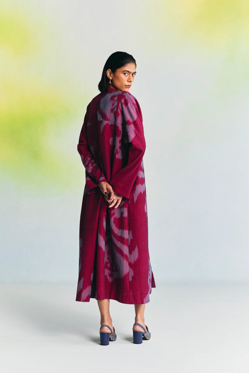 The dress is crafted in thicker cotton for a structured yet comfortable feel. It features a band collar with a high neckline and is designed with discreet side seam pockets for added functionality.