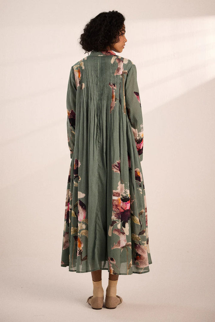 A flowing button-down dress in airy voile, adorned with a painterly floral print.