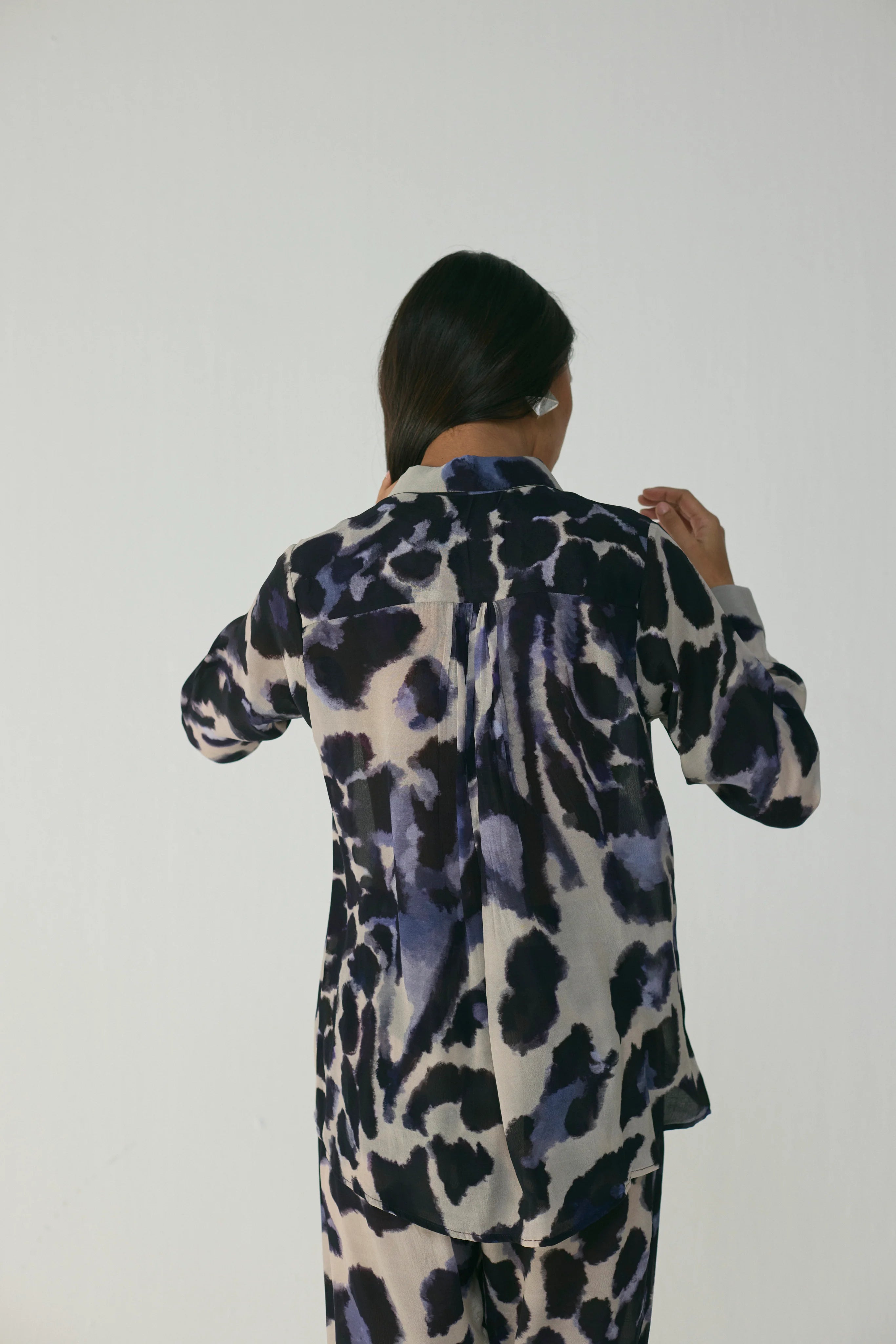 Crafted in luxurious crepe, this chic co-ord set effortlessly blends relaxed ease with sophisticated style. Comprising a button-down shirt and matching straight-fit pants, it features an abstract hand-painted-inspired print in deep navy and ivory, adding a contemporary edge to a timeless silhouette. The soft crepe fabric ensures fluidity, comfort, and graceful drape, making the set perfect for both casual and elevated occasions.