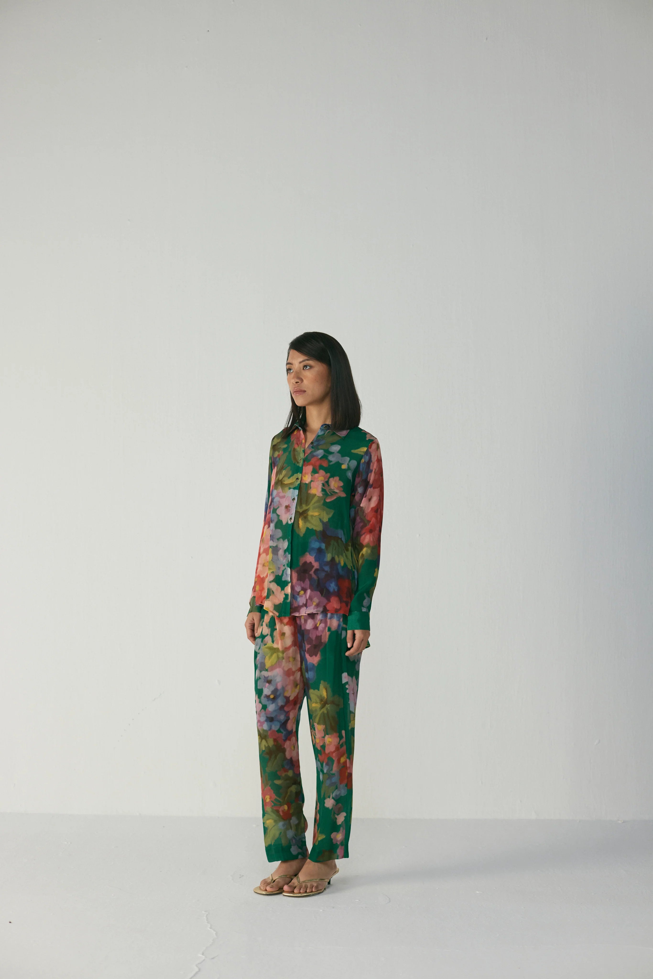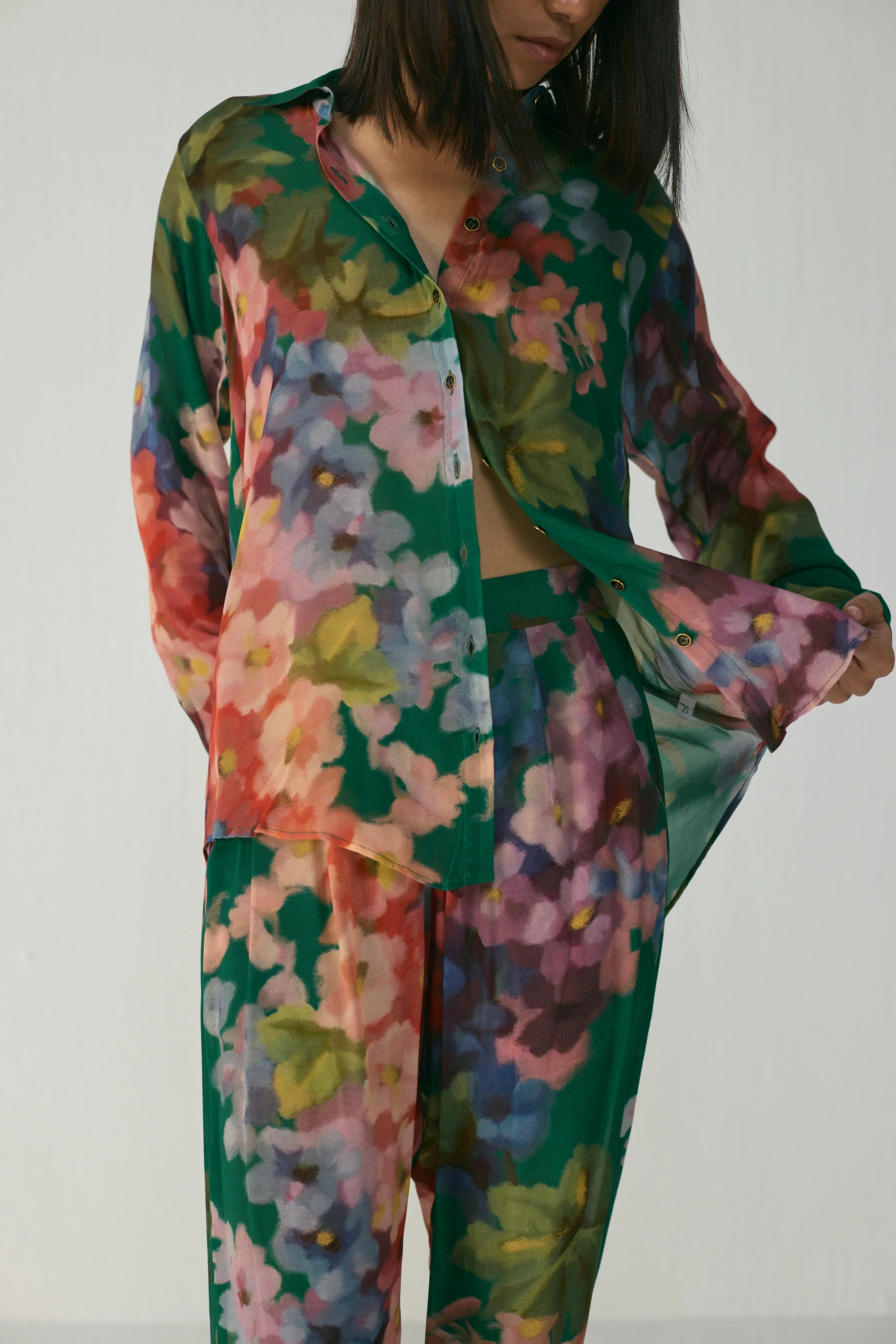 Crafted from premium poplin, this elegant midi dress features a bold painterly floral print that blends modern artistry with timeless charm. The design highlights a flattering V-neckline framed by a structured collar, complemented by wide half sleeves that bring ease and sophistication.