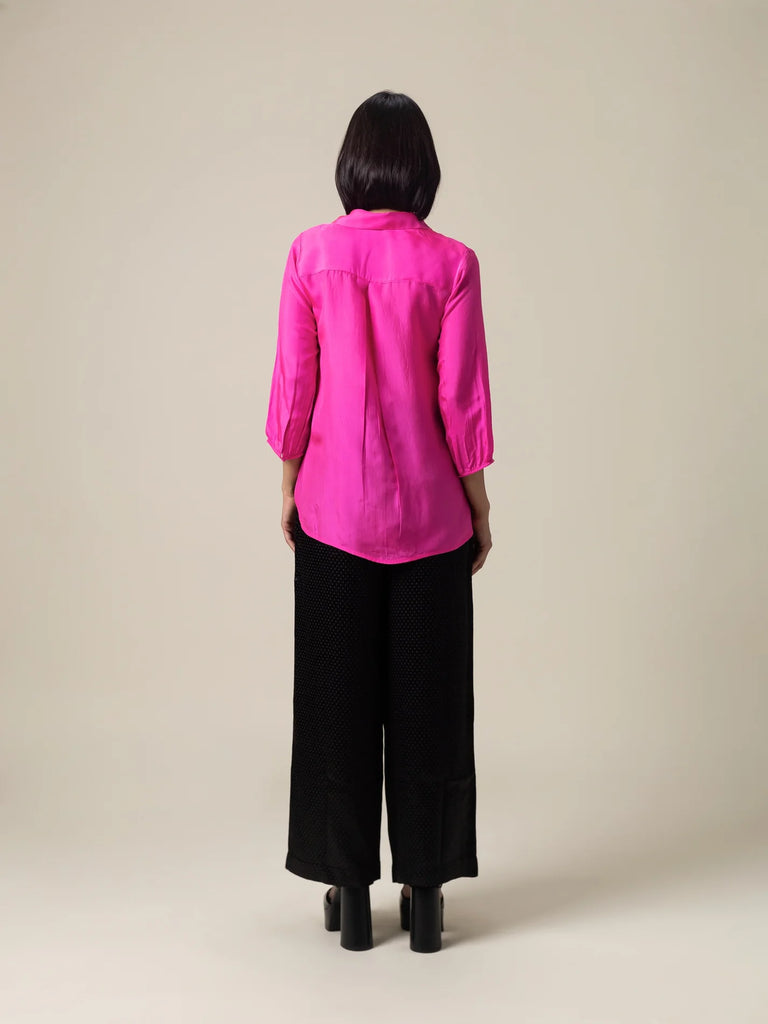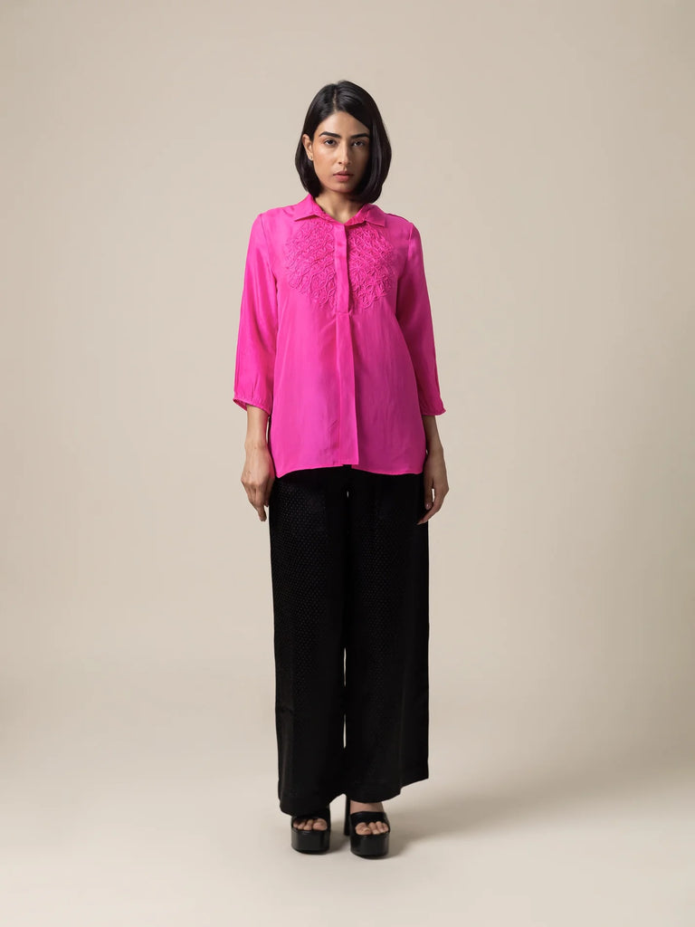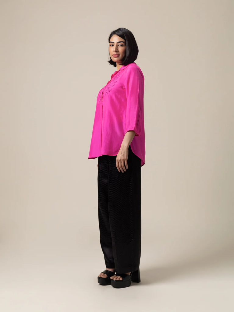 The Tokachi top in hot pink silk habutai stands out for its vibrant reinterpretation, enhanced with intricate circular embroidery and tonal bias detailing, finished with a classic collared neckline.