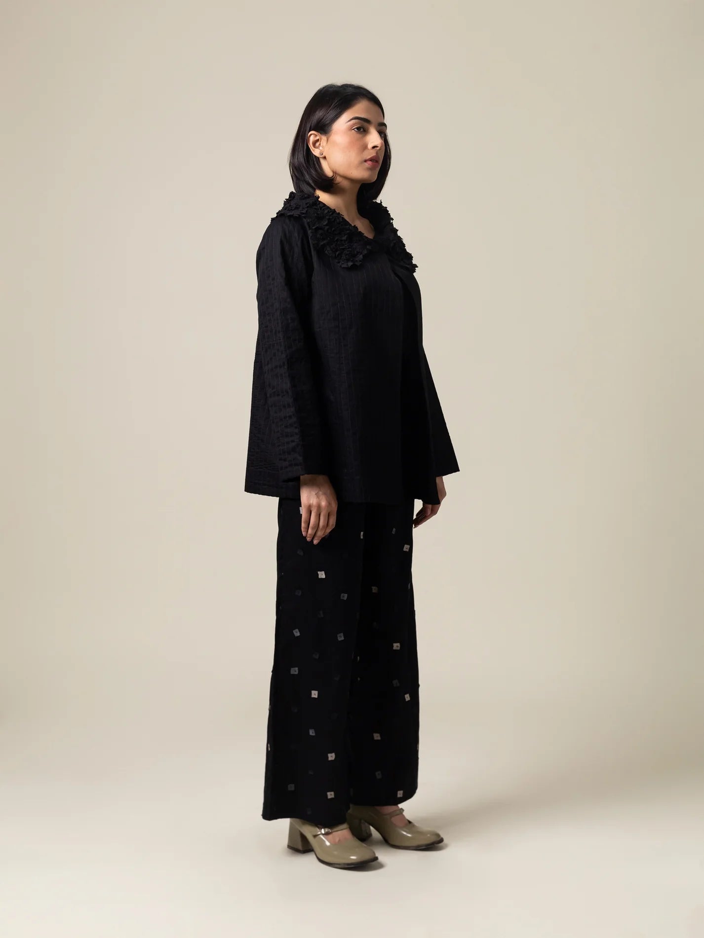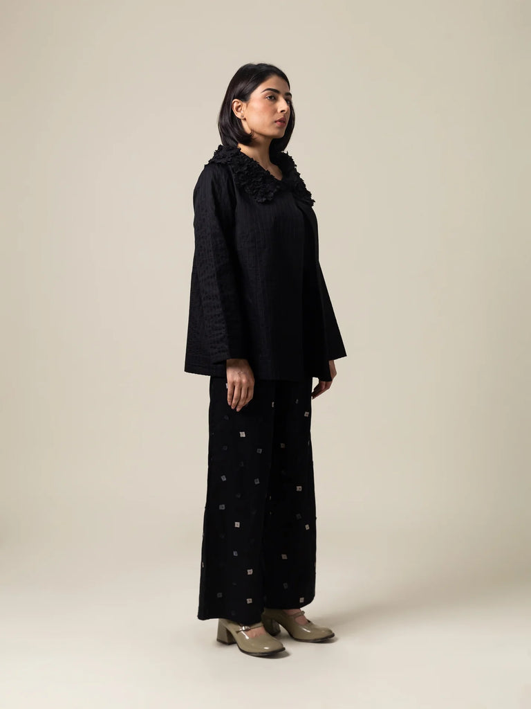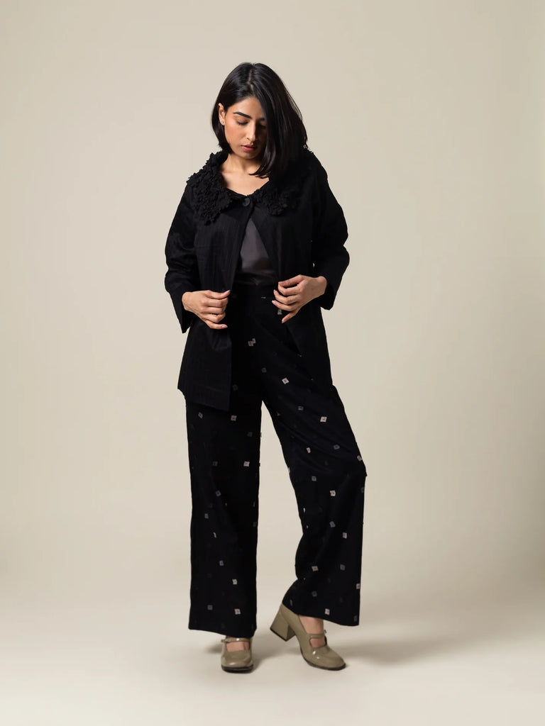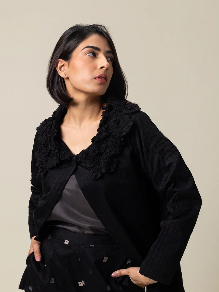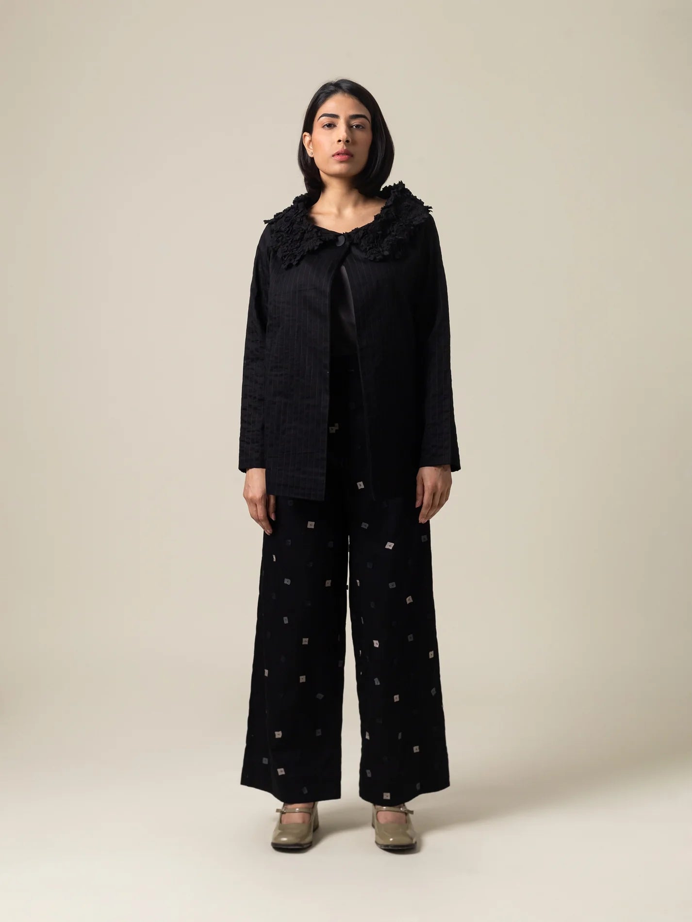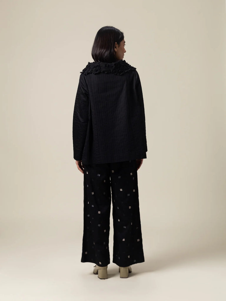 The Yori jacket, crafted in black cotton satin, features quilted grey dots and floral motifs. Detailed with delicate voile embroidery, intricate bias patti work, and a voile-wrapped button, it embodies quiet elegance.