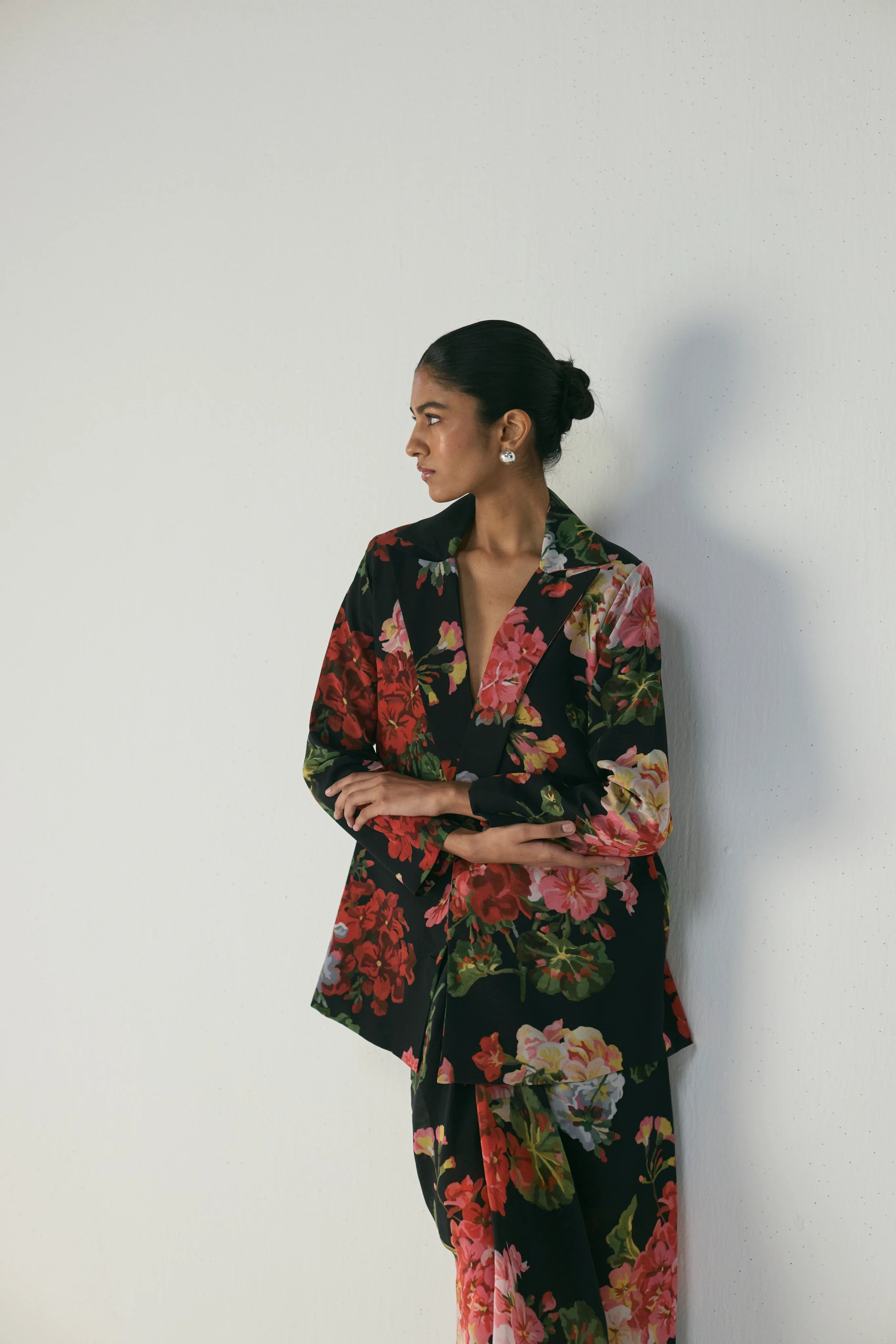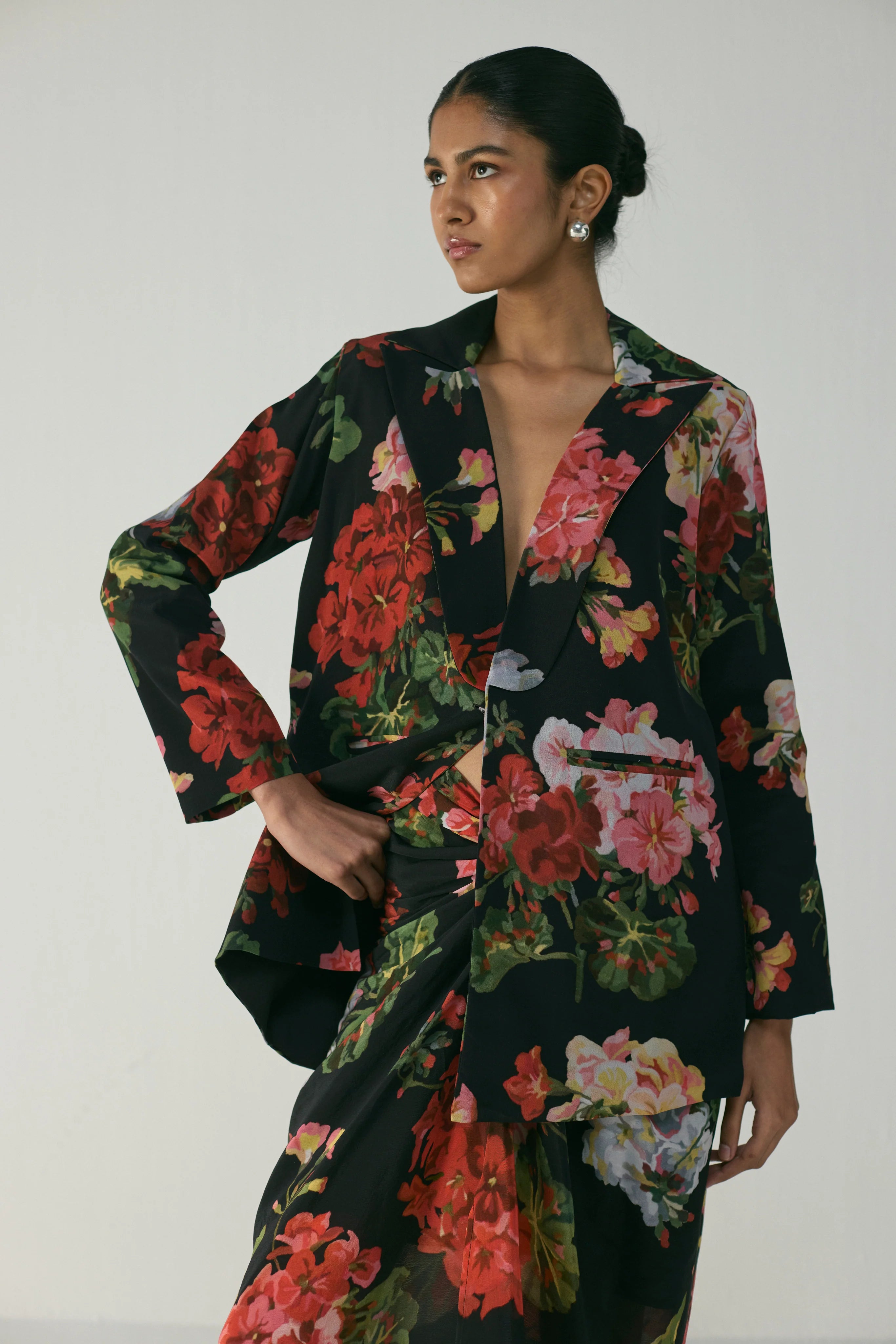 A modern take on floral elegance, this statement blazer and skirt set is crafted in luxurious crepe for a smooth, fluid drape and a refined finish. The ensemble pairs a tailored floral blazer with a coordinating printed draped skirt, striking a perfect balance between sharp structure and graceful movement.