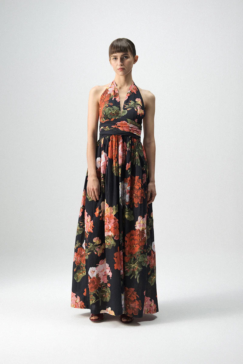 Crafted from crisp, breathable poplin, this halter-neck maxi dress balances refined structure with an airy, graceful drape. The tie-up halter neckline flatters the shoulders and back, while the fitted waistband enhances the silhouette. A voluminous, gathered skirt adds fluid movement, creating an effortlessly striking look with every step. Finished with a bold floral print in vivid hues of red, pink, and green set against a deep black base, this dress exudes drama and sophistication—perfect for both daytime events and evening occasions.