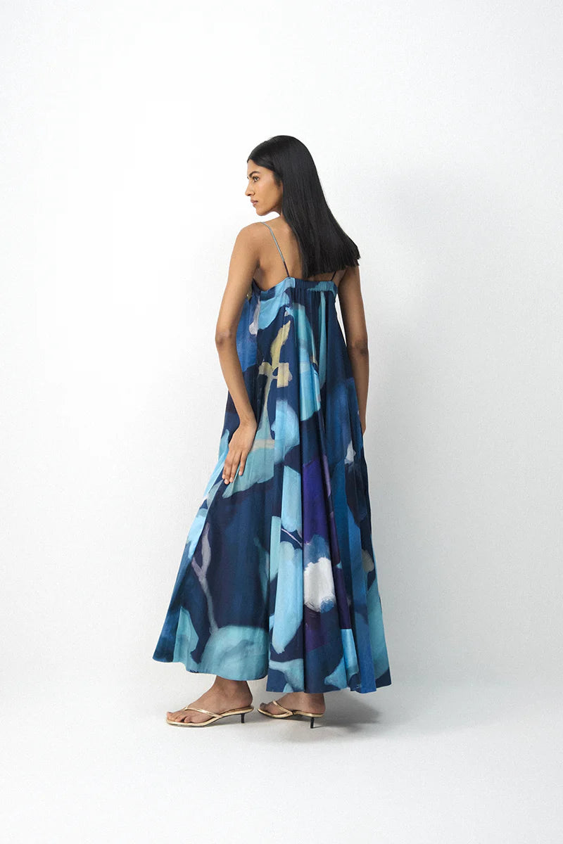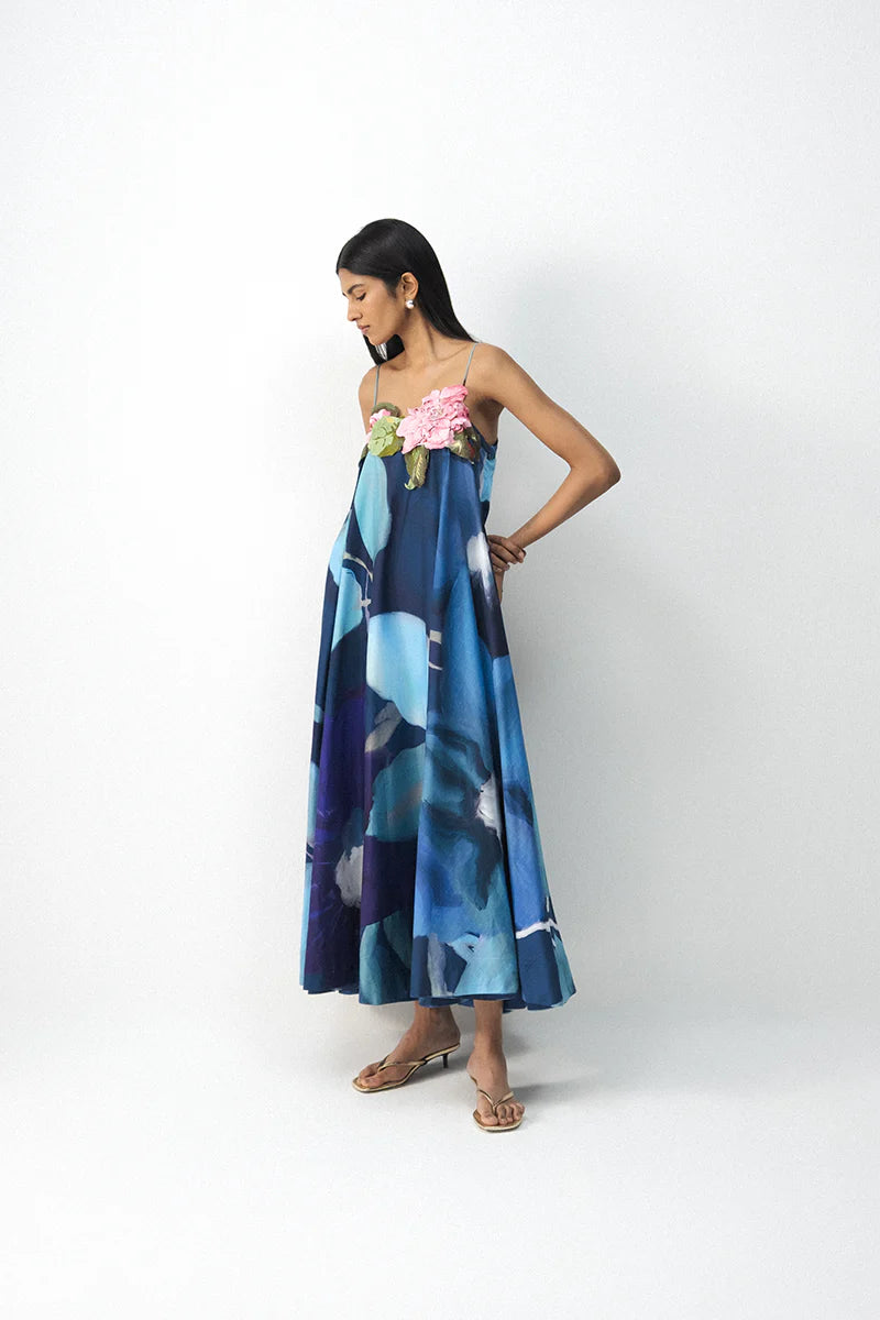 This breezy A-line maxi dress is crafted from soft, fluid cotton satin and features an expressive, hand-painted–inspired print in rich tones of cobalt, cerulean, and indigo. The bodice is beautifully highlighted with delicate machine-embroidered 3D floral appliqué—layered pink blooms accented with subtle green foliage—adding depth, texture, and romantic charm. Suspended from fine spaghetti straps, the silhouette flows effortlessly into a voluminous maxi length, moving gracefully with every step.