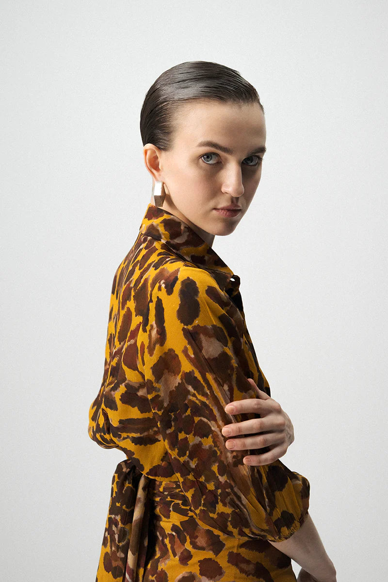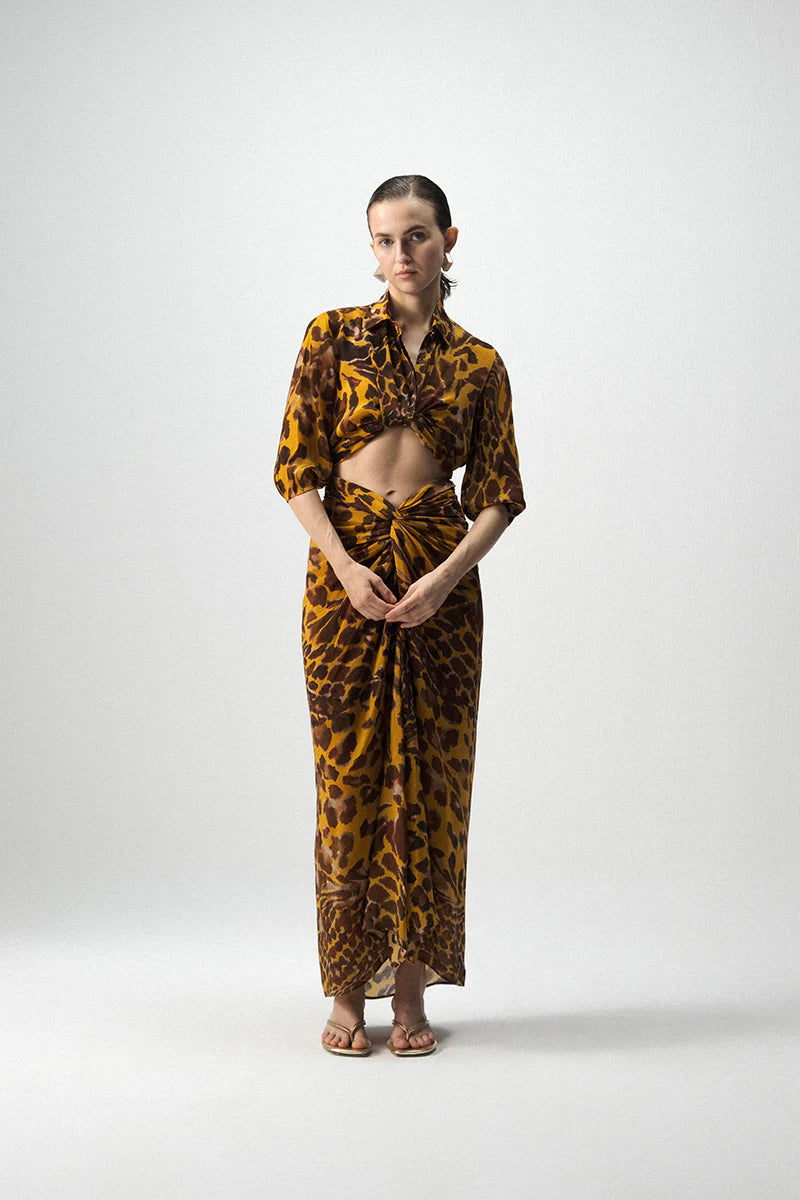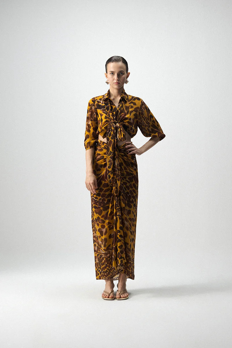 This tie-up top and knotted skirt set is crafted from luxurious crepe and adorned with a bold abstract animal-inspired print in warm ochre and brown tones. The ensemble features a front-tie crop shirt with a collared neckline and three-quarter sleeves, paired with a coordinated draped skirt that knots gracefully at the waist to create a flattering, sculpted silhouette. The fluidity of the crepe fabric enhances both movement and elegance, making it an effortlessly stylish choice for day-to-night dressing.