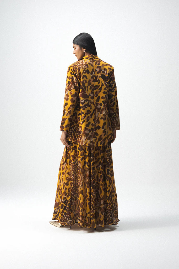 This refined dress is crafted from luxurious crepe and showcases a bold abstract print inspired by animal motifs in rich ochre and deep brown tones.