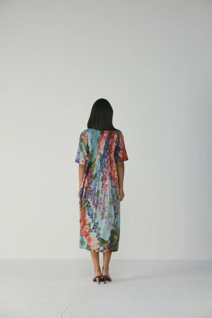 Crafted from lightweight, breathable cotton, this dress showcases an enchanting hand-painted floral-inspired digital print that blends shades of coral, indigo, lilac, and moss green over a soft blue base. Front and back pleated panel detailing lend graceful structure to the silhouette, enhancing its fluid charm.