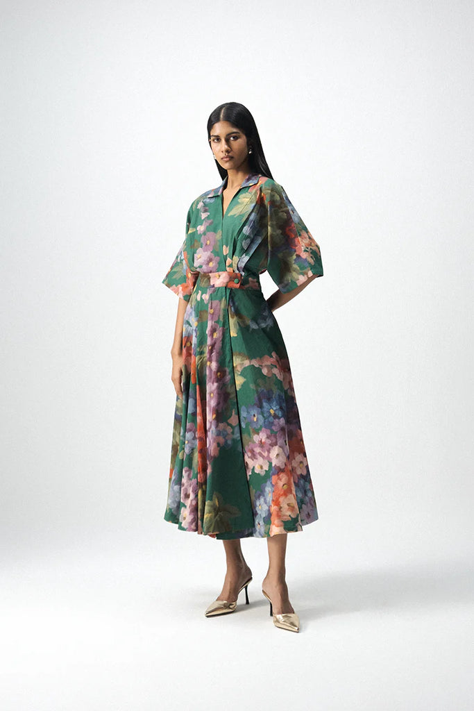 Crafted from premium poplin, this elegant midi dress features a bold painterly floral print that blends modern artistry with timeless charm. The design highlights a flattering V-neckline framed by a structured collar, complemented by wide half sleeves that bring ease and sophistication.