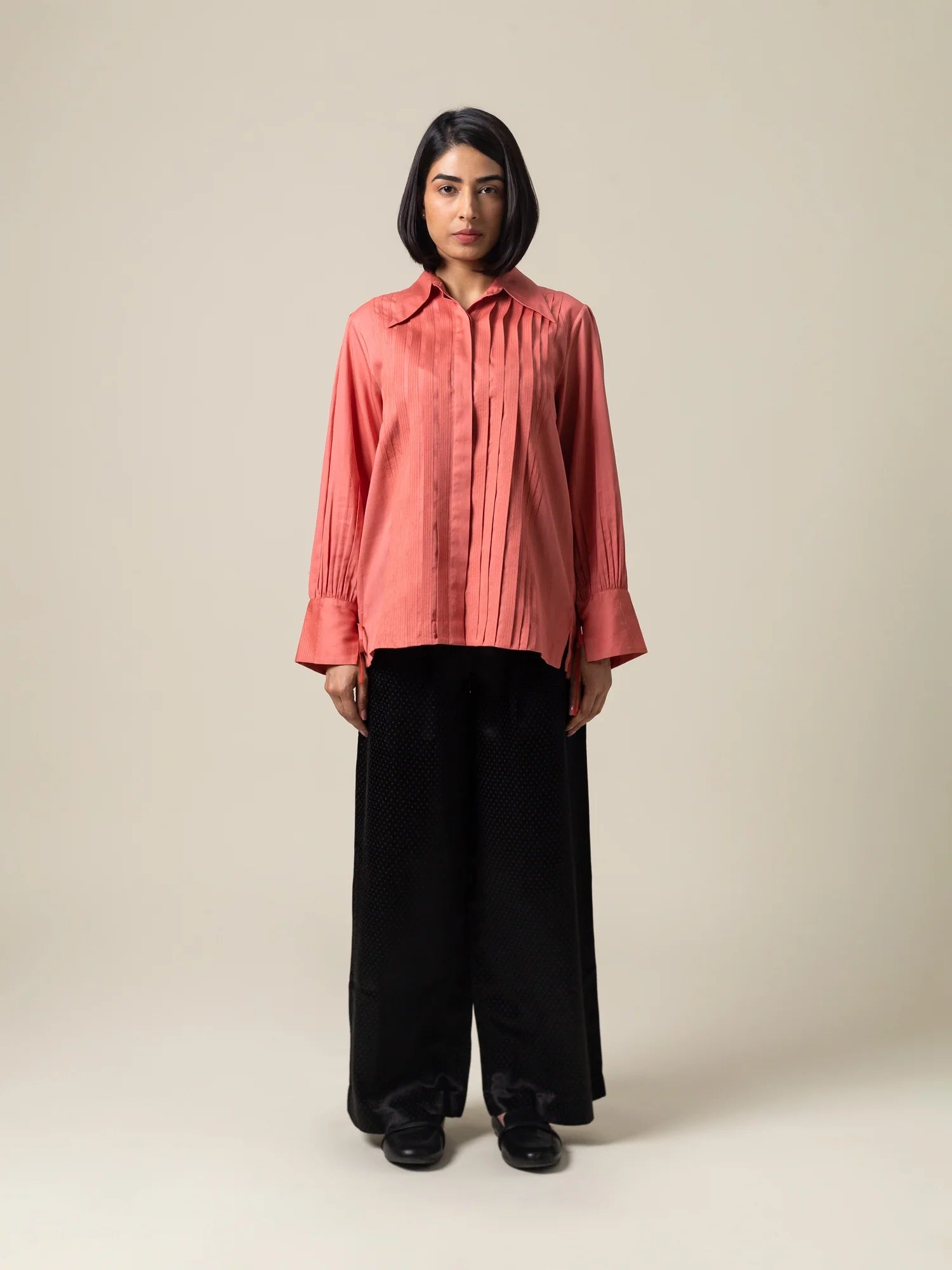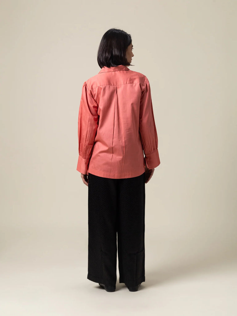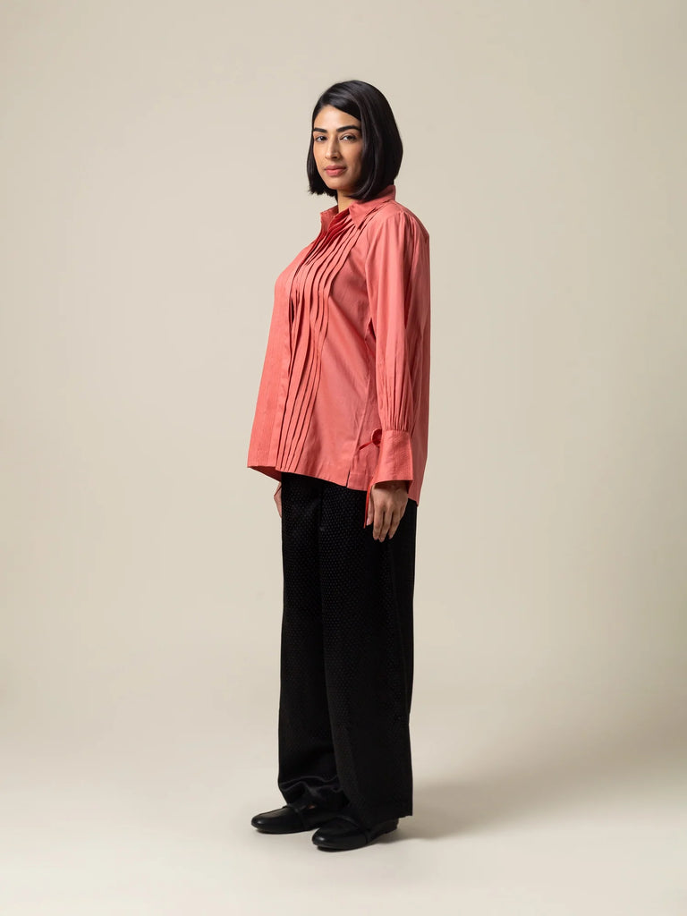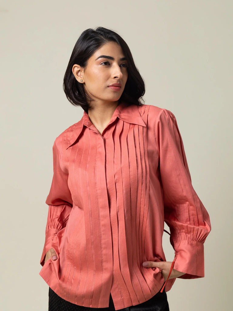 The Aakeshi shirt, tailored in pink cotton satin, showcases graceful pleats and classic dot accents, complemented by delicate embroidery. Finished with a soft tie-up cuff and a winged collar that adds subtle lift, it embodies effortless refinement.
