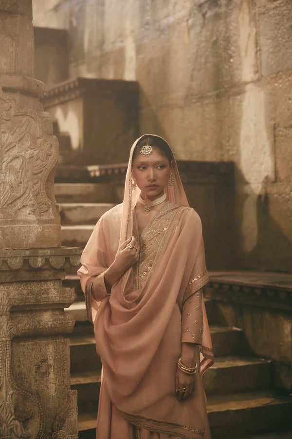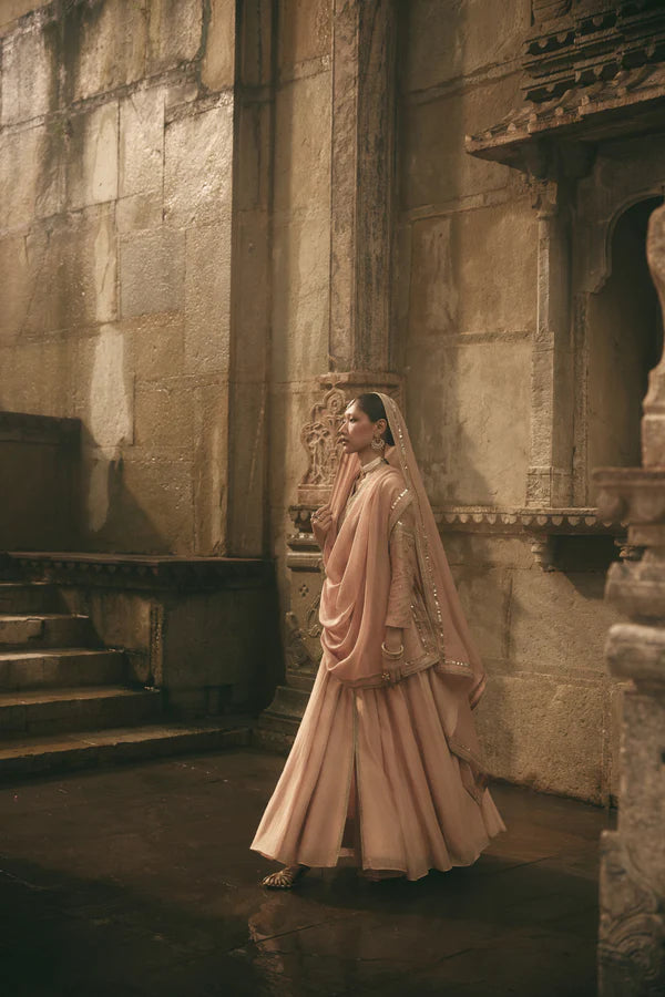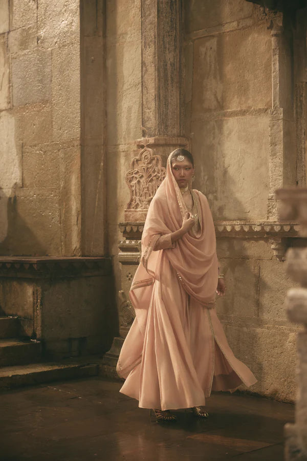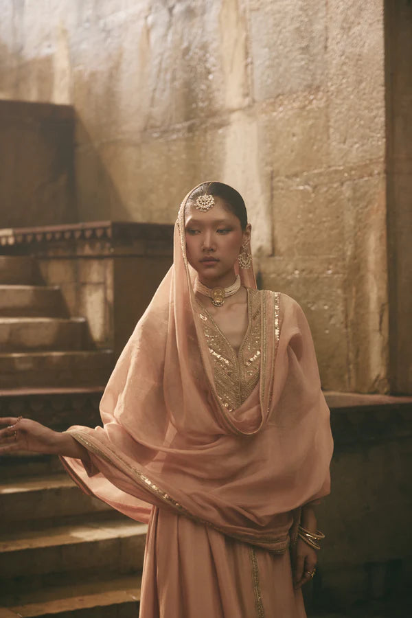 This beautifully crafted beige Chanderi anarkali set features intricate gota work and a delicately dori-embroidered yoke on both the front and back. Paired with a matching cotton churidar and an elegant organza dupatta, this ensemble exudes timeless elegance and refinement.