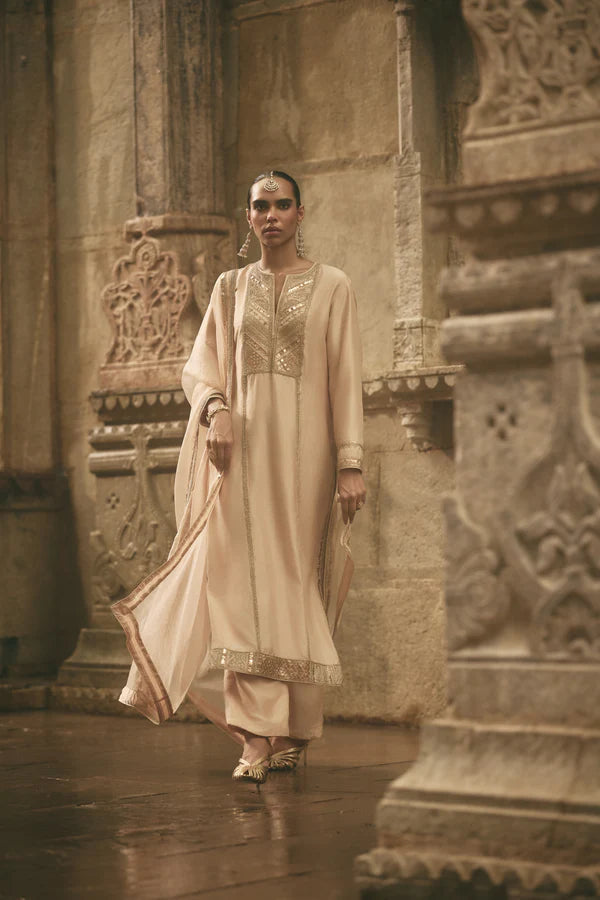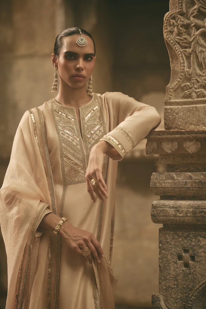 Timeless elegance defines this beige silk kurta set, showcasing exquisite heavy dori and gota embroidery on the yoke and bottom panels. Paired with matching pants and an elegant organza dupatta, this ensemble is perfect for special occasions.