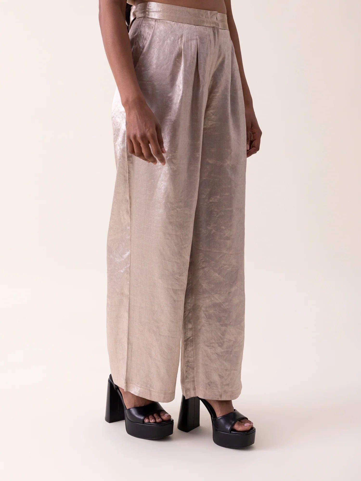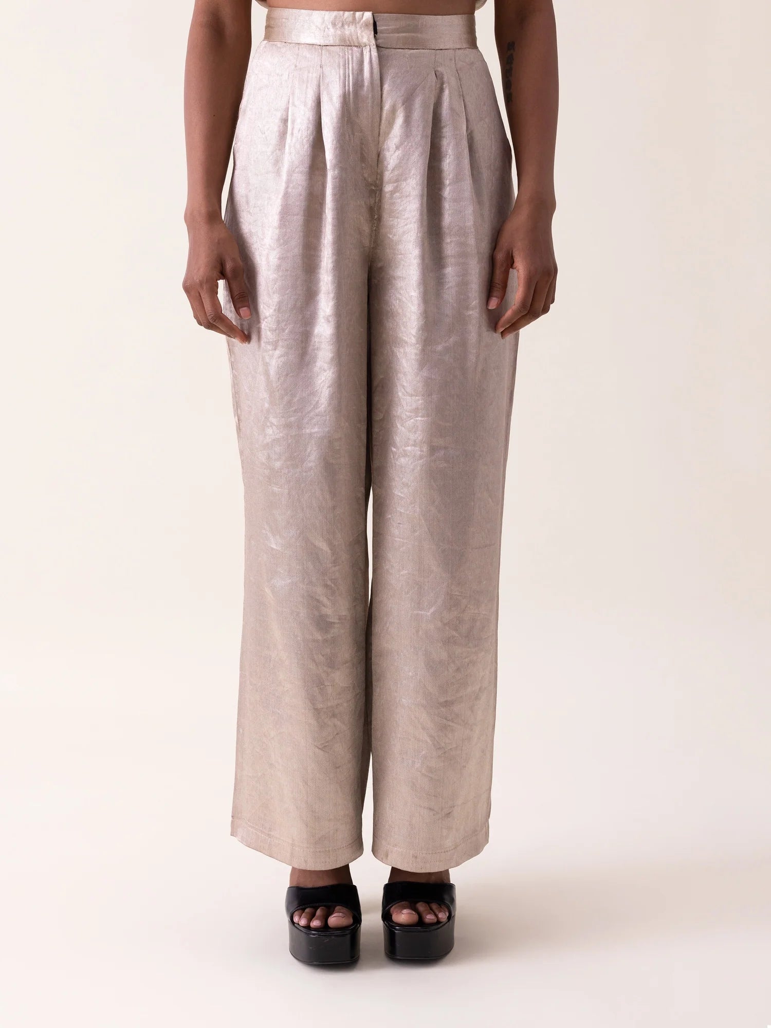 Beige-silver twill-tissue pants featuring soft pleats and a fluid drape. Designed with side pockets and an elasticated back, they offer a refined yet effortlessly comfortable silhouette.