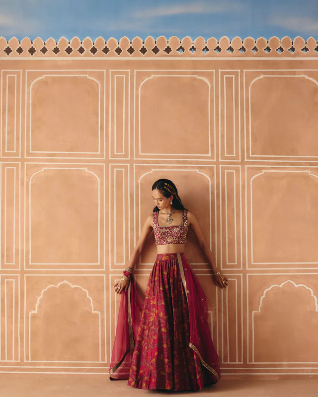 Featuring a gathered skirt paired with an intricately embroidered blouse, complemented by an embroidered organza dupatta.