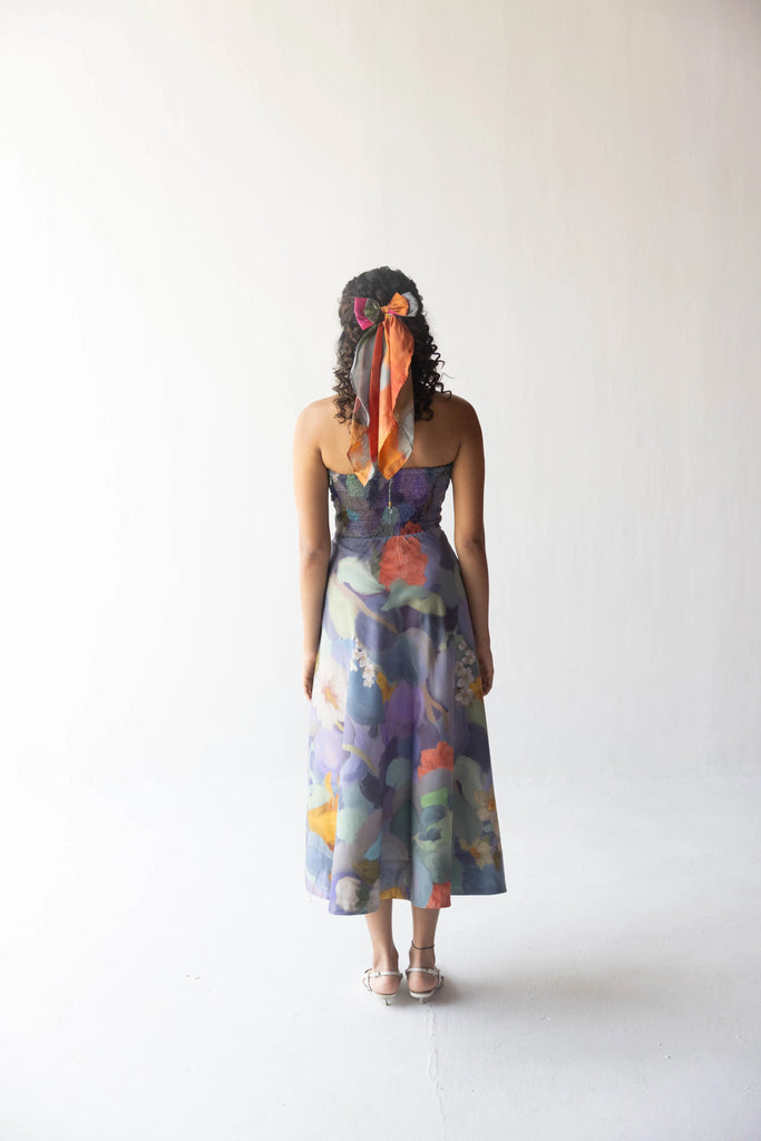The Blueberry Grove Dress, a stunning blend of fabrics designed for both style and comfort. The upper body is crafted from luxurious crepe, while the lower body is made from premium cotton satin.