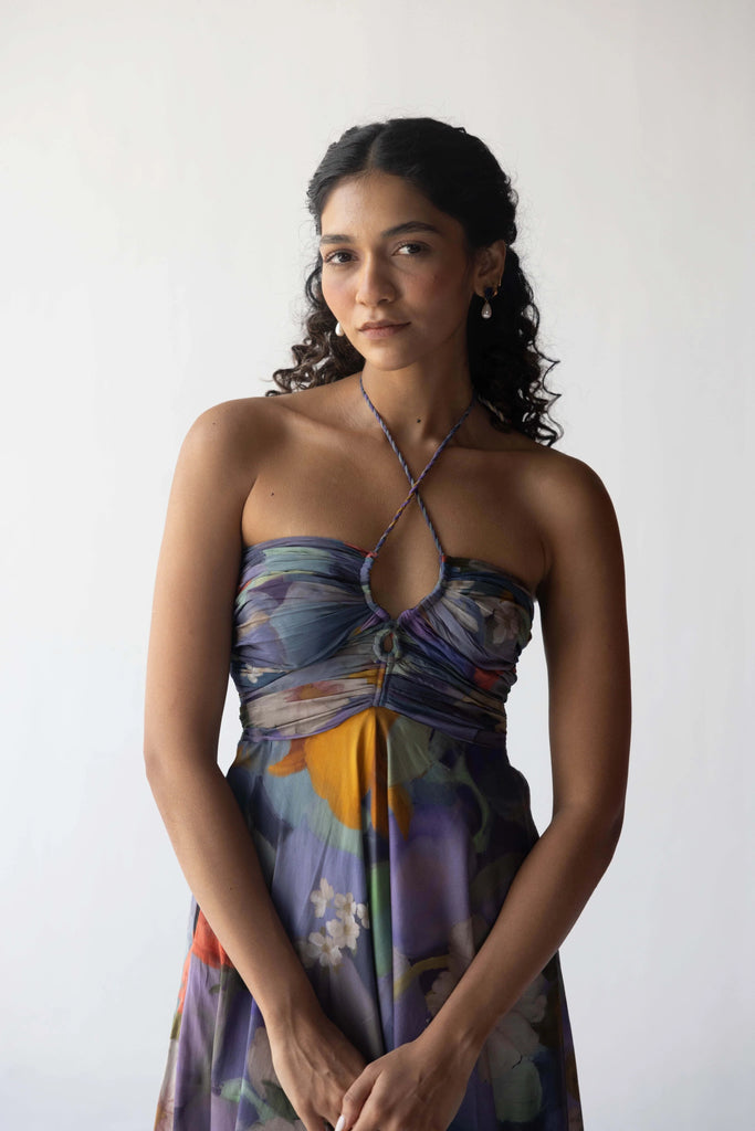 The dress features back elasticating for a perfect fit, and the front is ruched with braided strings for a chic tie-up neckline. Additional details include a concealed side zipper and a convenient right-side pocket.