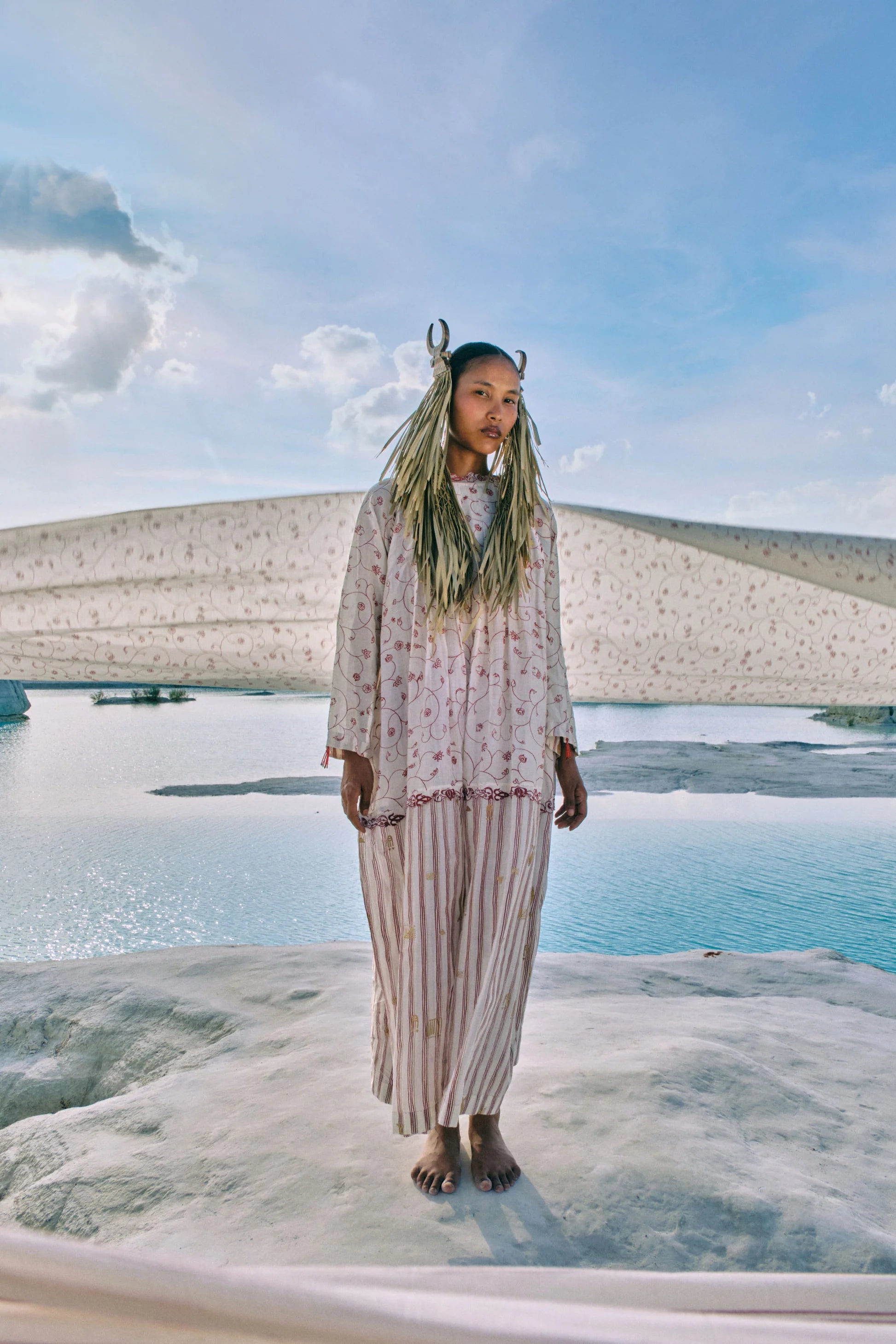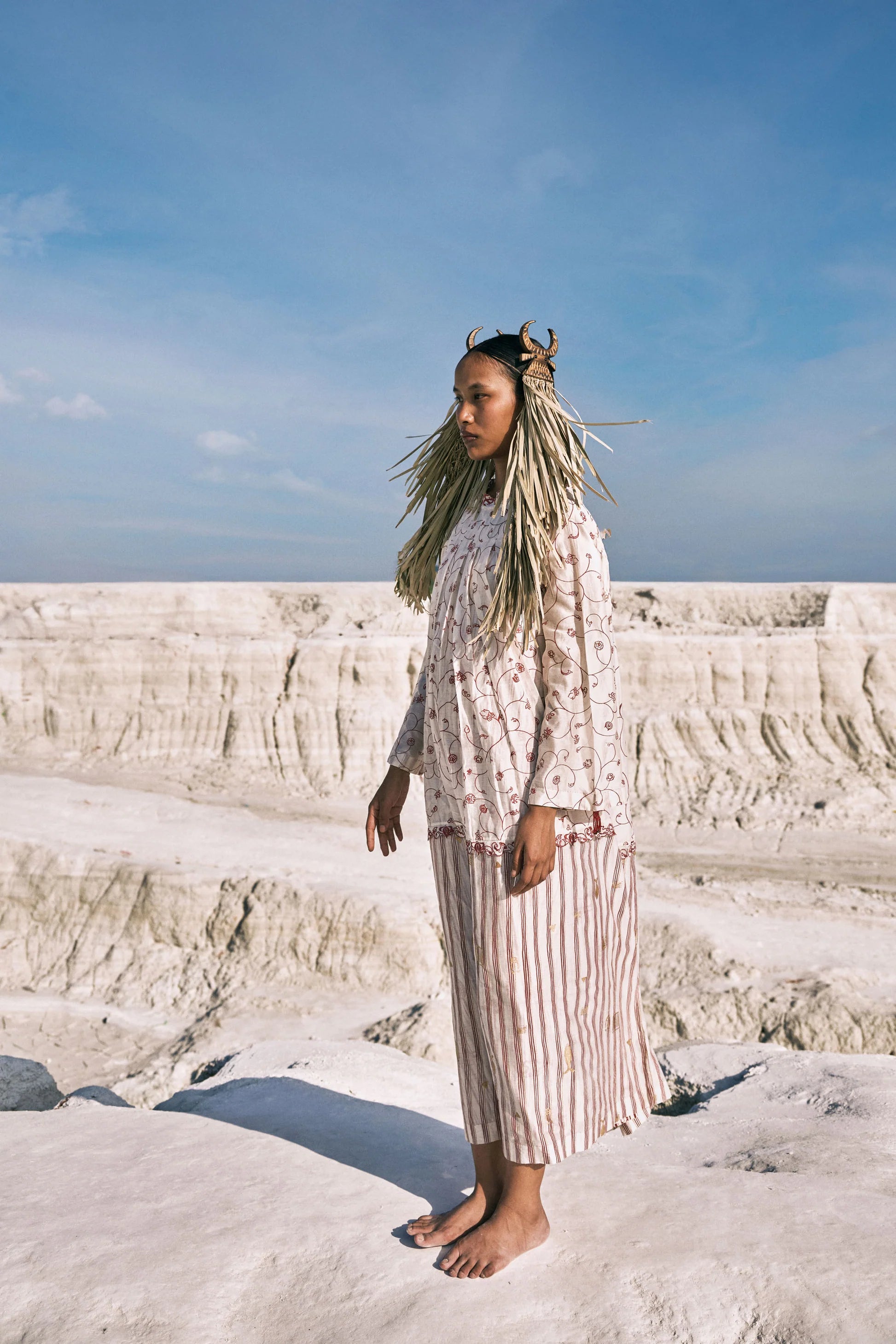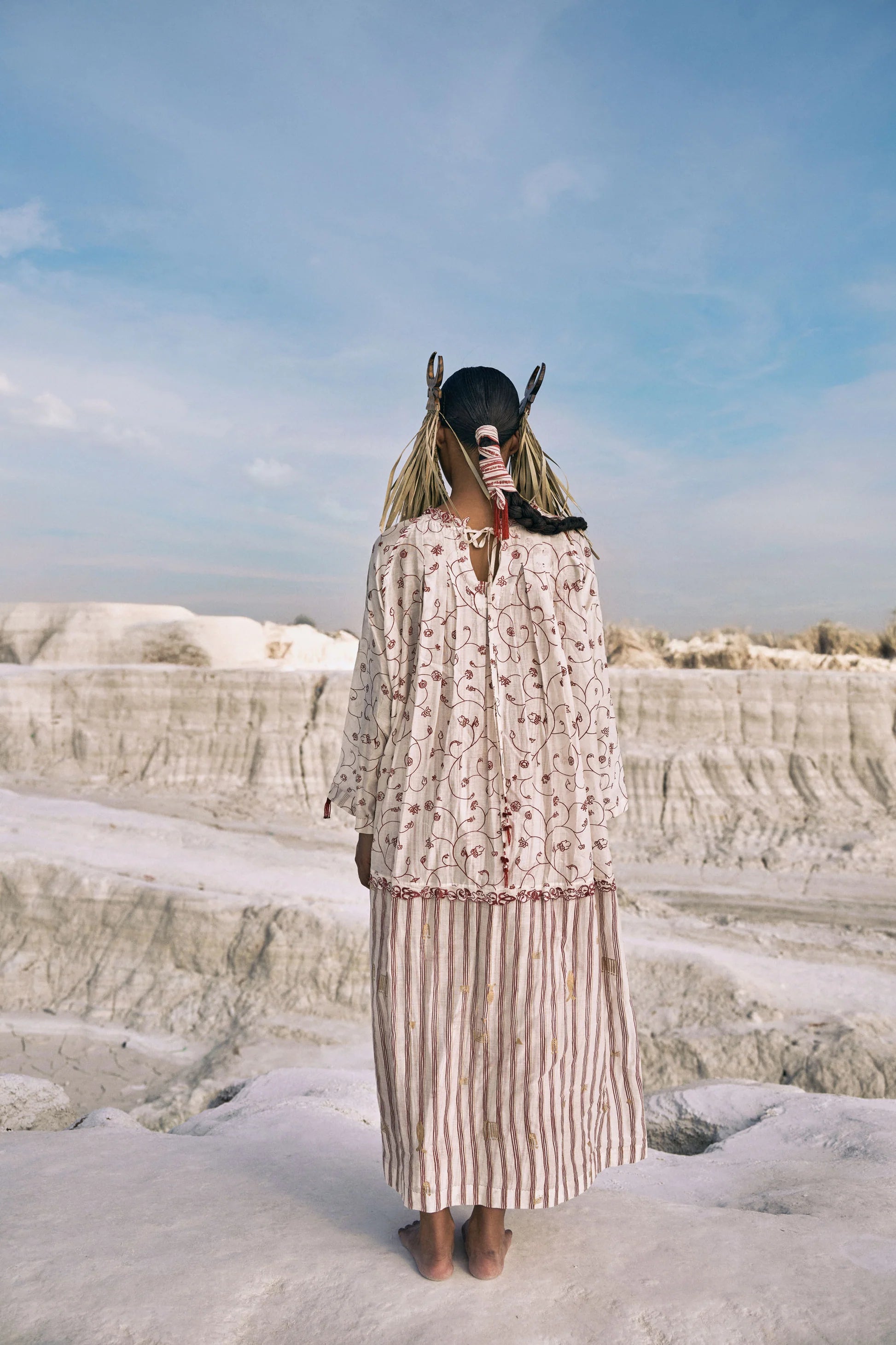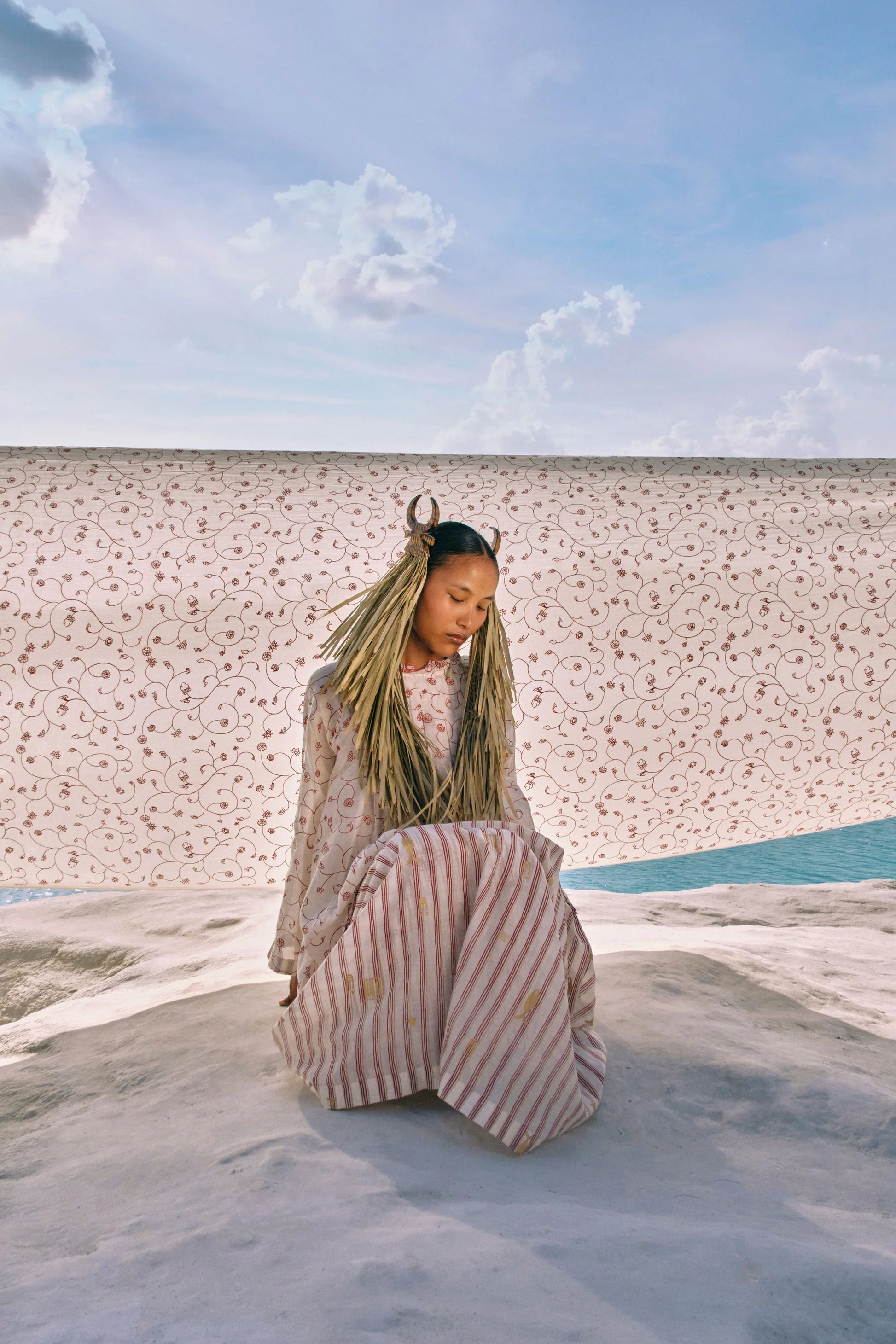 A refined expression of structure and craftsmanship, the Chan Box Pleat Dress is crafted in contrasting hand screen-printed cotton silk. Box pleats along the yoke and embroidered lace at the neckline bring understated sophistication, while raglan sleeves finished with bias binding create a softly defined silhouette. A back tie-up adorned with handmade beaded tassels adds a delicate finishing touch. Every pleat, stitch, and detail reflects hours of careful artisanal work, resulting in a piece where elegance and craftsmanship come together seamlessly.