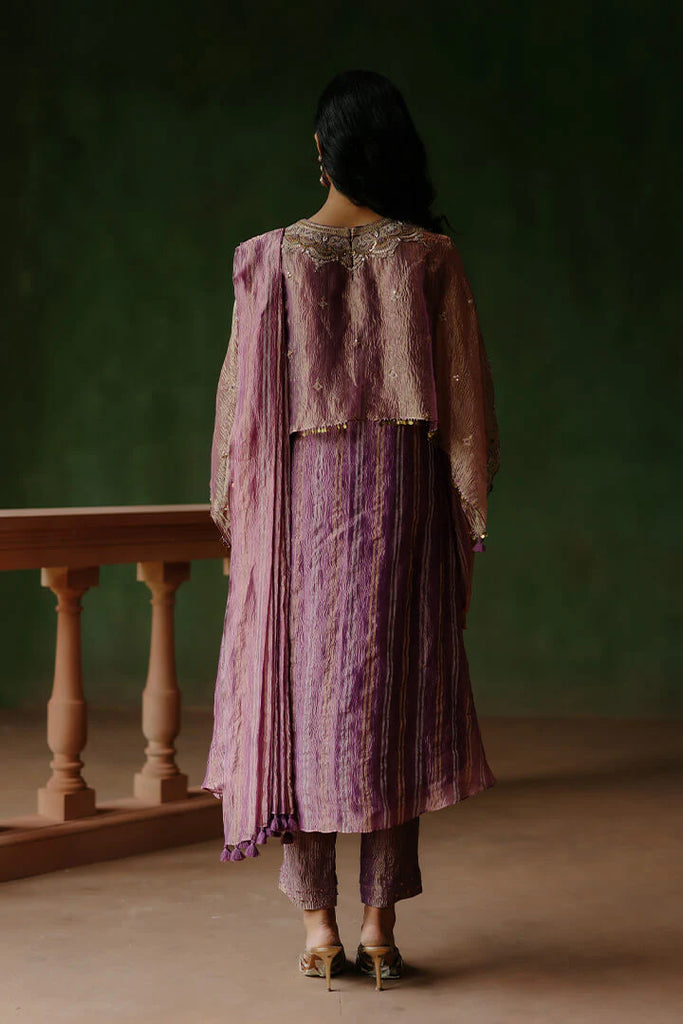 The Dilara drape kurta set features a crushed stripe tissue kurta with an embroidered neckline and an attached dupatta. It's paired with matching crushed stripe tissue pants.