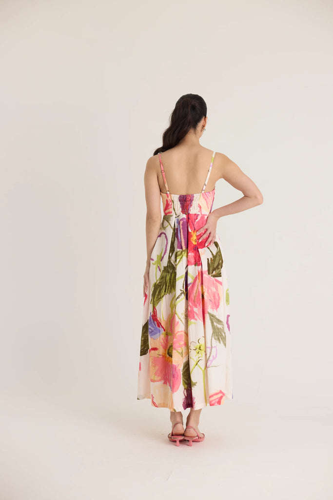 A dreamy, feminine silhouette adorned with a bold hand-painted floral print, this strappy maxi dress is perfect for sunlit days and elegant evenings. Featuring a structured bodice with delicate spaghetti straps and a flowing skirt, the design balances romance and sophistication effortlessly. The oversized floral print in vibrant pinks, reds, and purples against a soft ivory background makes it a statement piece