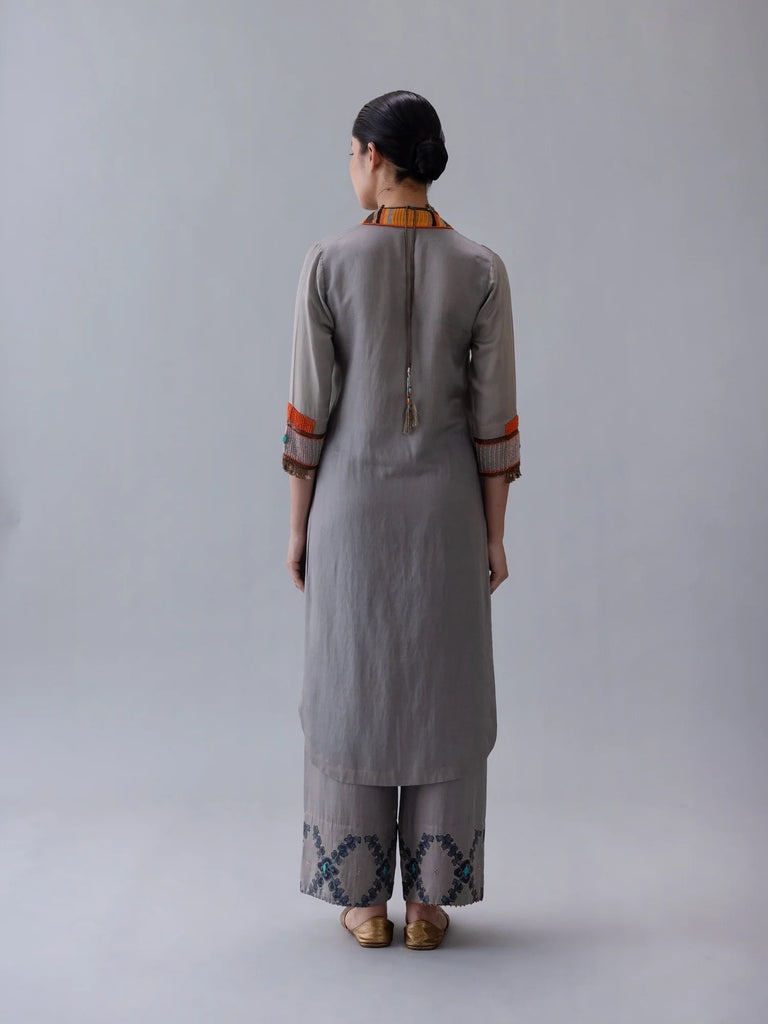 Dzong kurta in grey silk cotton satin, featuring a structured V-collar highlighted with beadwork. orange facings at neckline and hem, with intricate adda cuffs, add depth, contrast, and refined character.