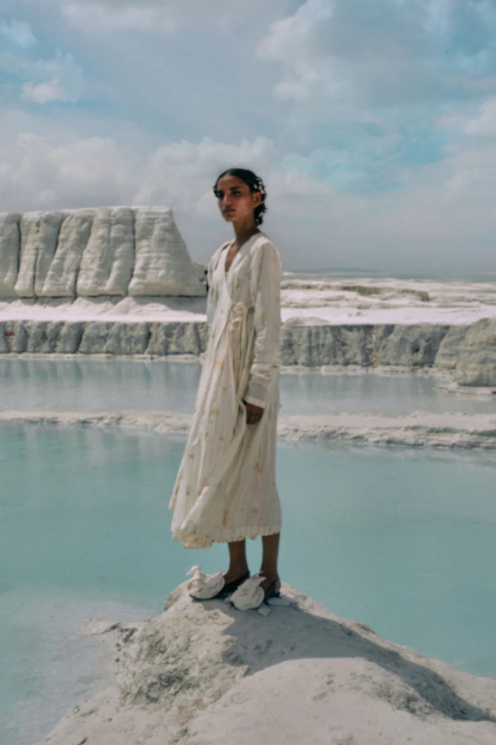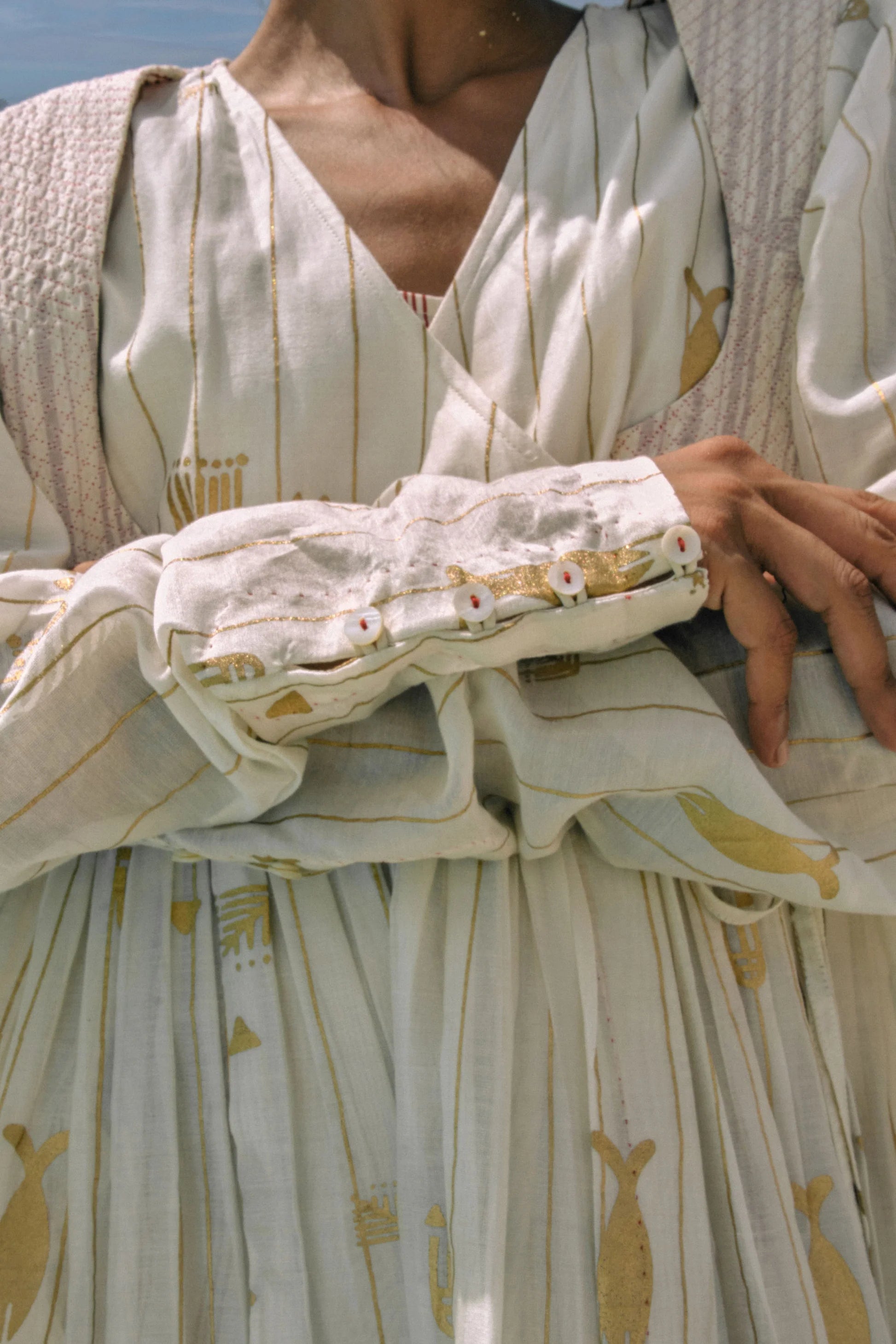 the Elysia Angrakha is crafted in hand-screen-printed cotton silk, designed to pair beautifully with a variety of bottoms. The silhouette features a quilted yoke and softly overlapping panels, fastened with tie-ups adorned with handmade beaded tassels. Traditional gathered sleeves with delicate button-loop cuffs lend a touch of classic charm. Worn with a cotton slip, it drapes with ease—perfect for warm, languid days while embodying understated elegance. Every stitch and tassel reflects hours of dedicated artisanal craftsmanship, making the piece both thoughtful and timeless.