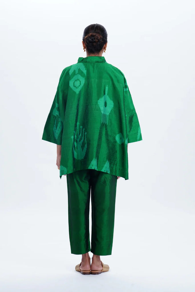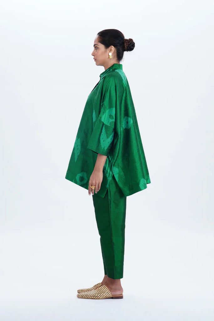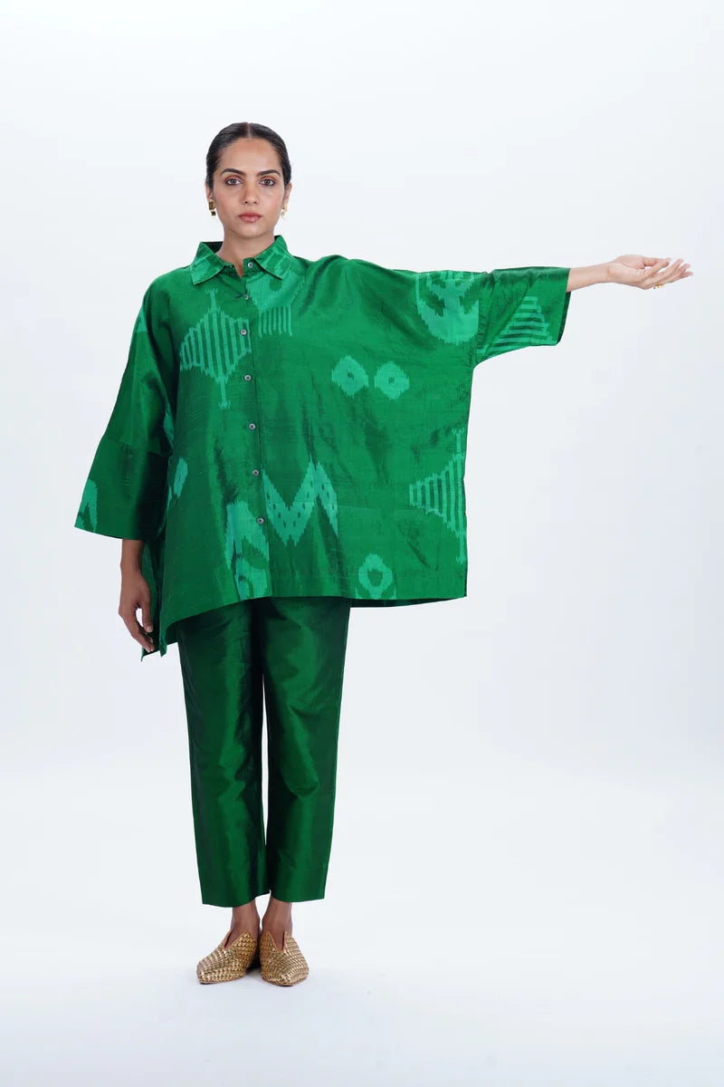 This shirt showcases a stylish high-low hem paired with a classic point collar. It features a front button opening and 3/4th sleeves, making it an effortlessly elegant wardrobe staple.