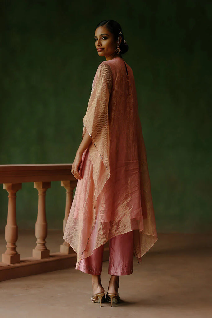 The Falak kaftan set features a crushed tissue kaftan with a heavily embroidered marodi and zardosi yoke and tikki detailing along the edges. It's paired with cotton silk pants.