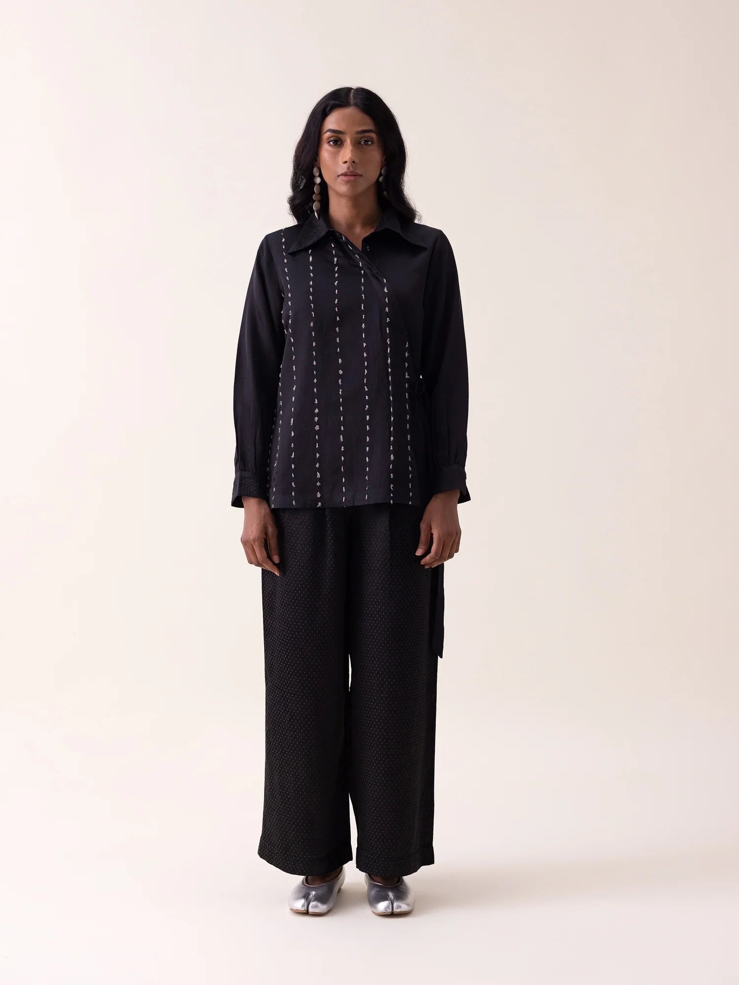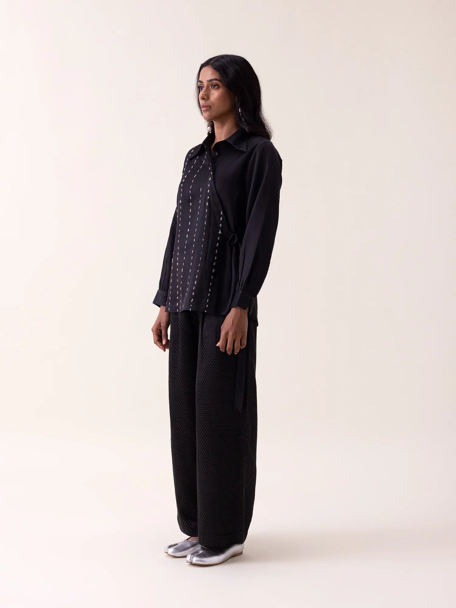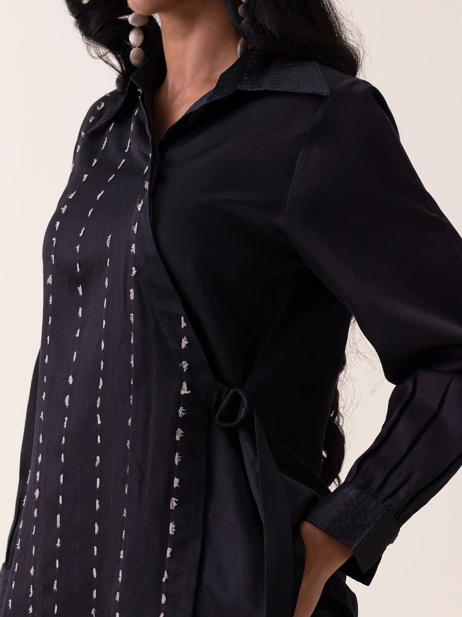Light mashru shirt enhanced with kantha-style stitching and delicate zari dots. A waist buckle defines the silhouette while preserving soft fluidity, creating a refined black essential with quiet, intentional texture.