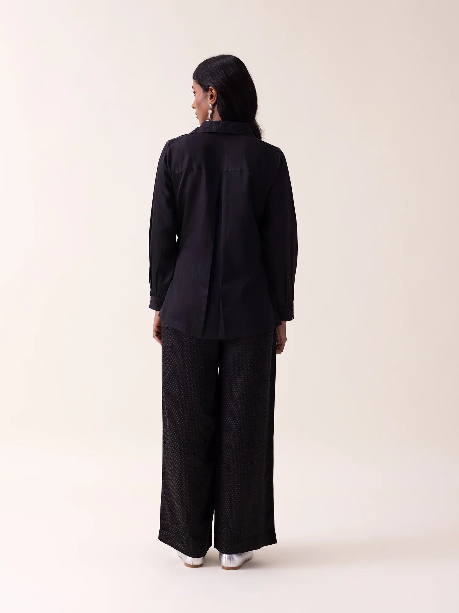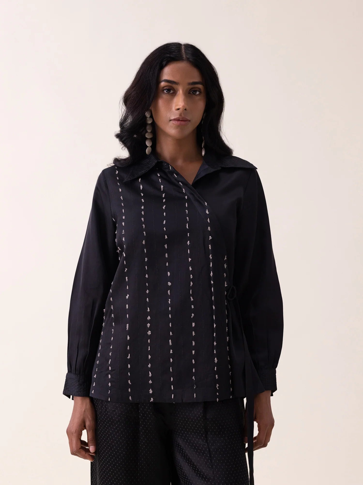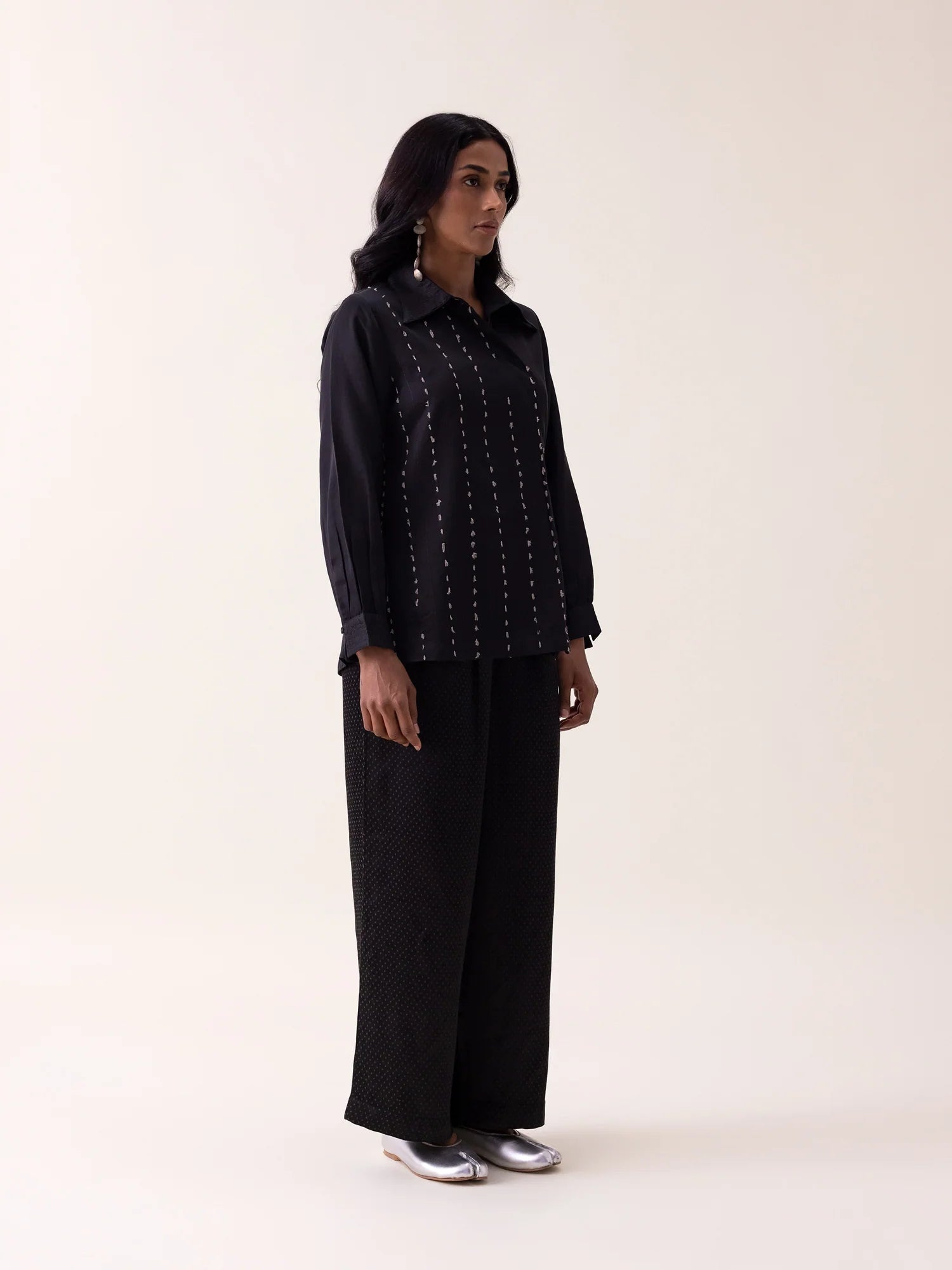 Light mashru shirt enhanced with kantha-style stitching and delicate zari dots. A waist buckle defines the silhouette while preserving soft fluidity, creating a refined black essential with quiet, intentional texture.