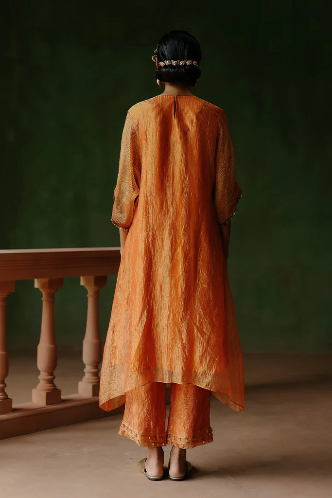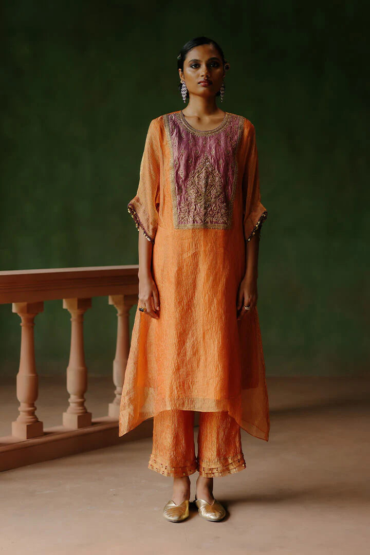 The Gulnar kurta set features a crushed tissue kurta with a heavily embroidered contrast yoke in marodi and zardozi techniques. It's paired with matching crushed tissue pants that have bead and tikki detailing at the hem.