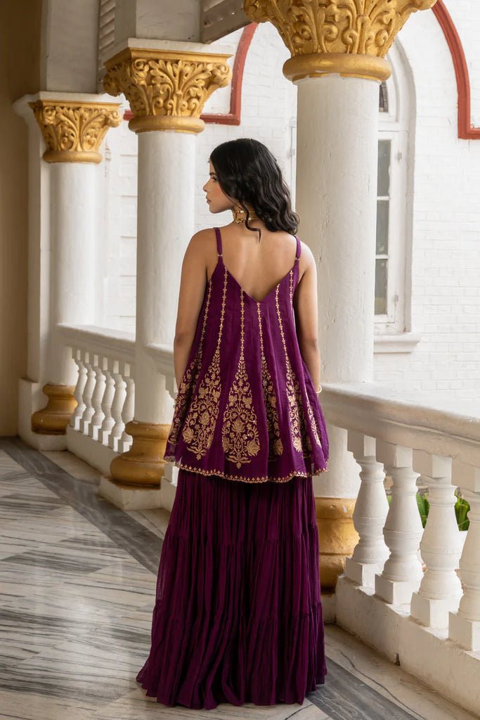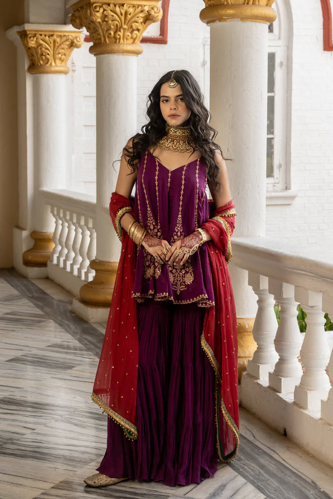 Meet Gulzaar . a name that evokes the lush beauty of a rose garden, and her ensemble blossoms just as vividly. Draped in deep jambuni pure Chanderi, she wears an anti-fit ensemble featuring a V‑neckline and adjustable straps, where kalis are accented by both precise machine embroidery and delicate hand stitching. Paired with a ghera layered sharara, the silhouette flows with enchanting volume and artisanal detail. Completing her look is a “talking” red dupatta—scattered fully with buttis and edged with ghunghroos that chime softly with each step, bringing melody and motion to every graceful sway.