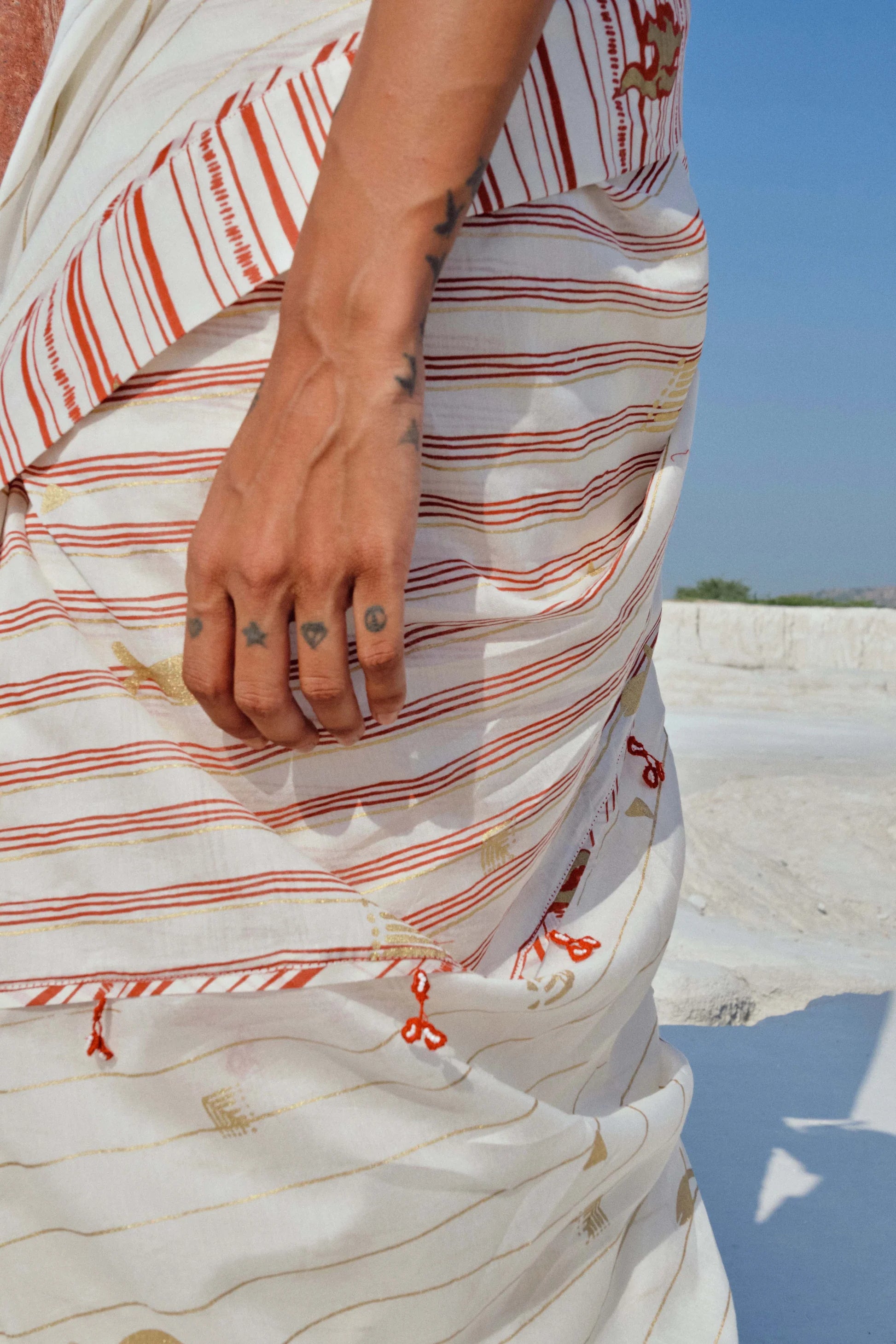 • Hand-embroidered and beaded tassels along the edge and throughout the saree