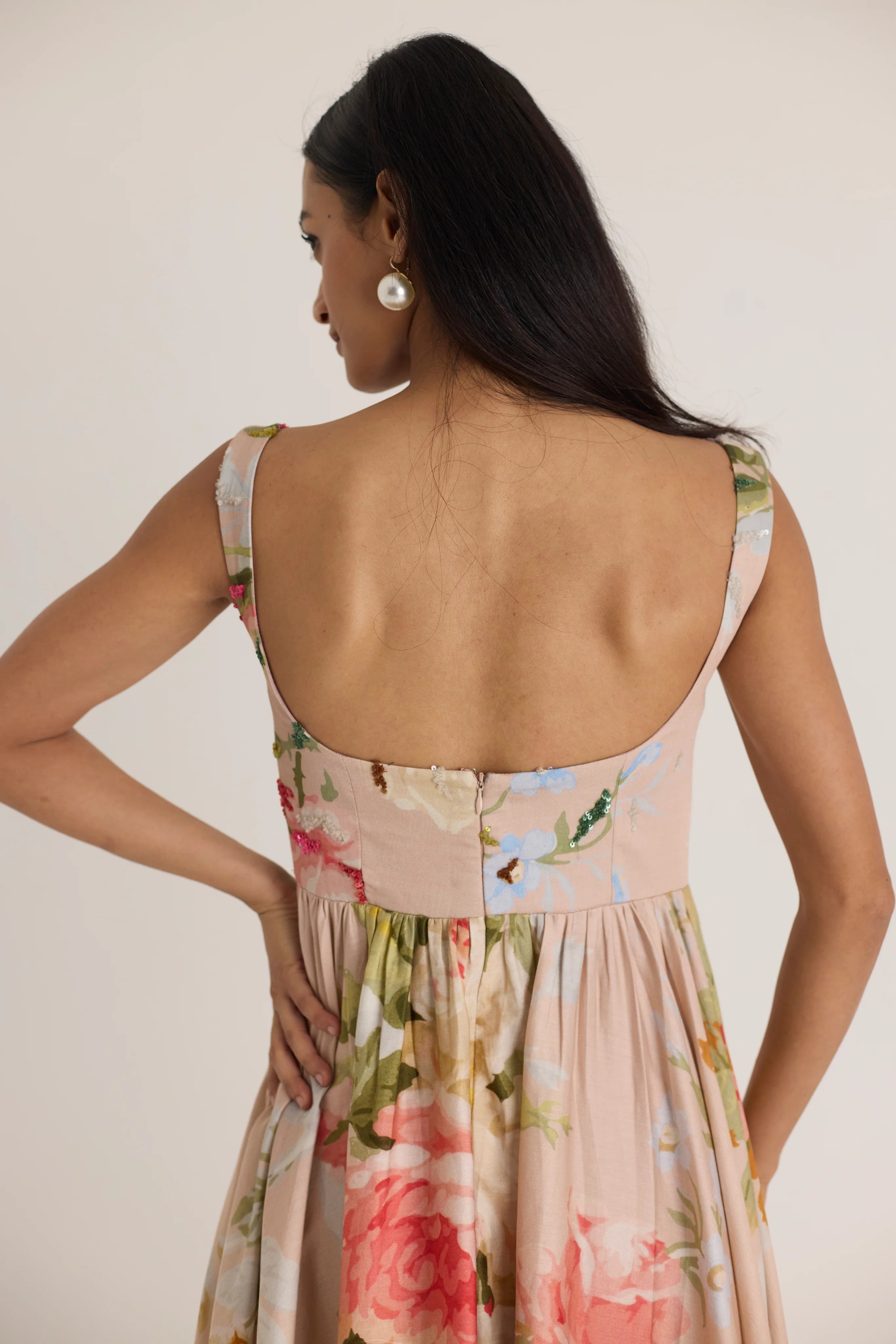 The delicately embroidered bodice adds a touch of artisanal craftsmanship, elevating the beauty of its floral print. Designed with a soft, rounded neckline and broad straps, the fitted bodice gracefully transitions into a voluminous skirt, creating a flattering silhouette. The intricate floral print in soft blush, pink, and green hues adds a touch of romantic charm, making it the perfect piece for garden parties, brunches, or summer soirées.