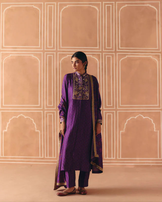 Featuring a print-on-print kurta set highlighted with intricate embroidered yoke detailing, paired with a placement-print dupatta for a refined, cohesive look.