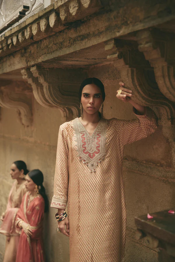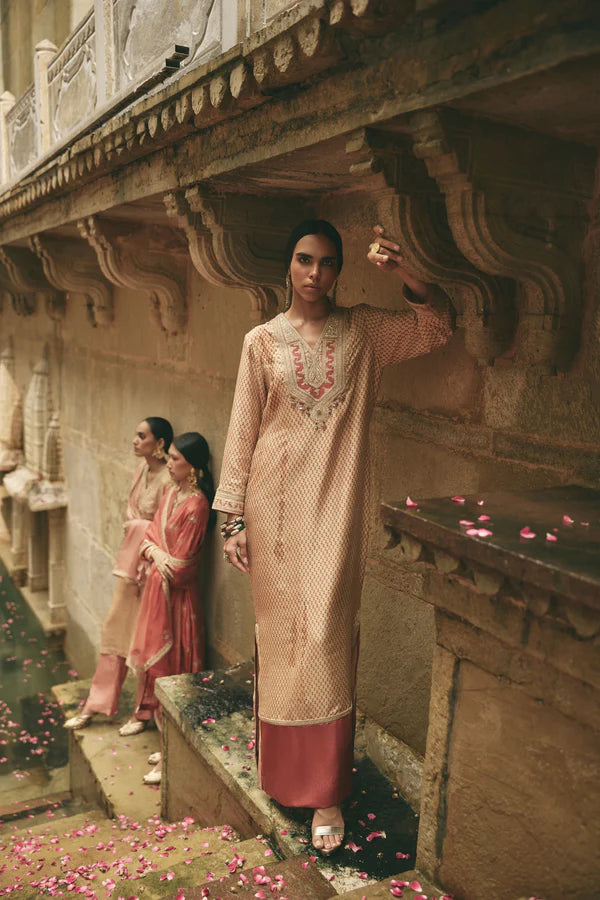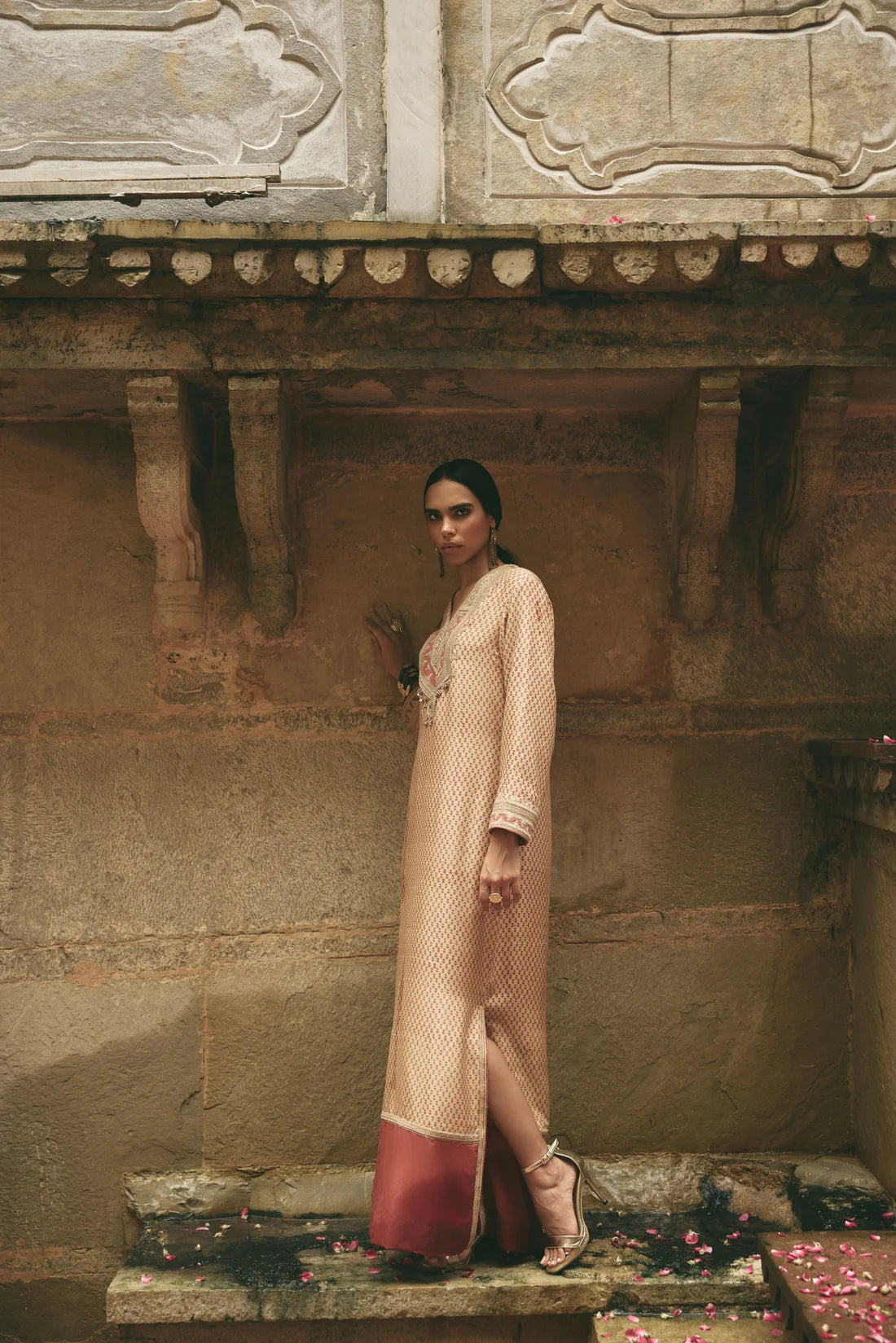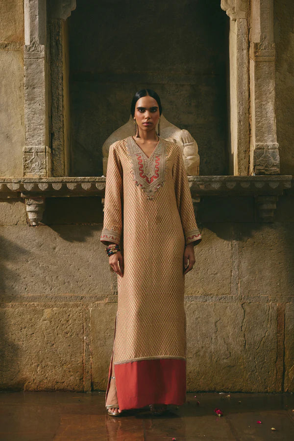 This exquisite Fadat silk long dress showcases a beautifully embroidered dori work yoke, with intricate detailing on the sleeves and slits. The look is completed with a vibrant red silk bottom panel for a striking finish.