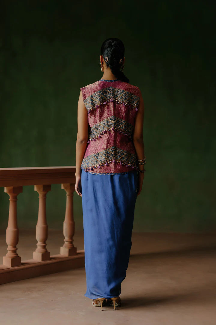 The Leena Jacket Set features a panelled crushed tissue jacket, beautifully embellished with intricate marodi and resham embroidery, and finished with elegant tassel accents. It is layered over a matching crushed tissue bustier and paired with a flowing organza drape skirt, creating a look that blends fluidity with fine craftsmanship.