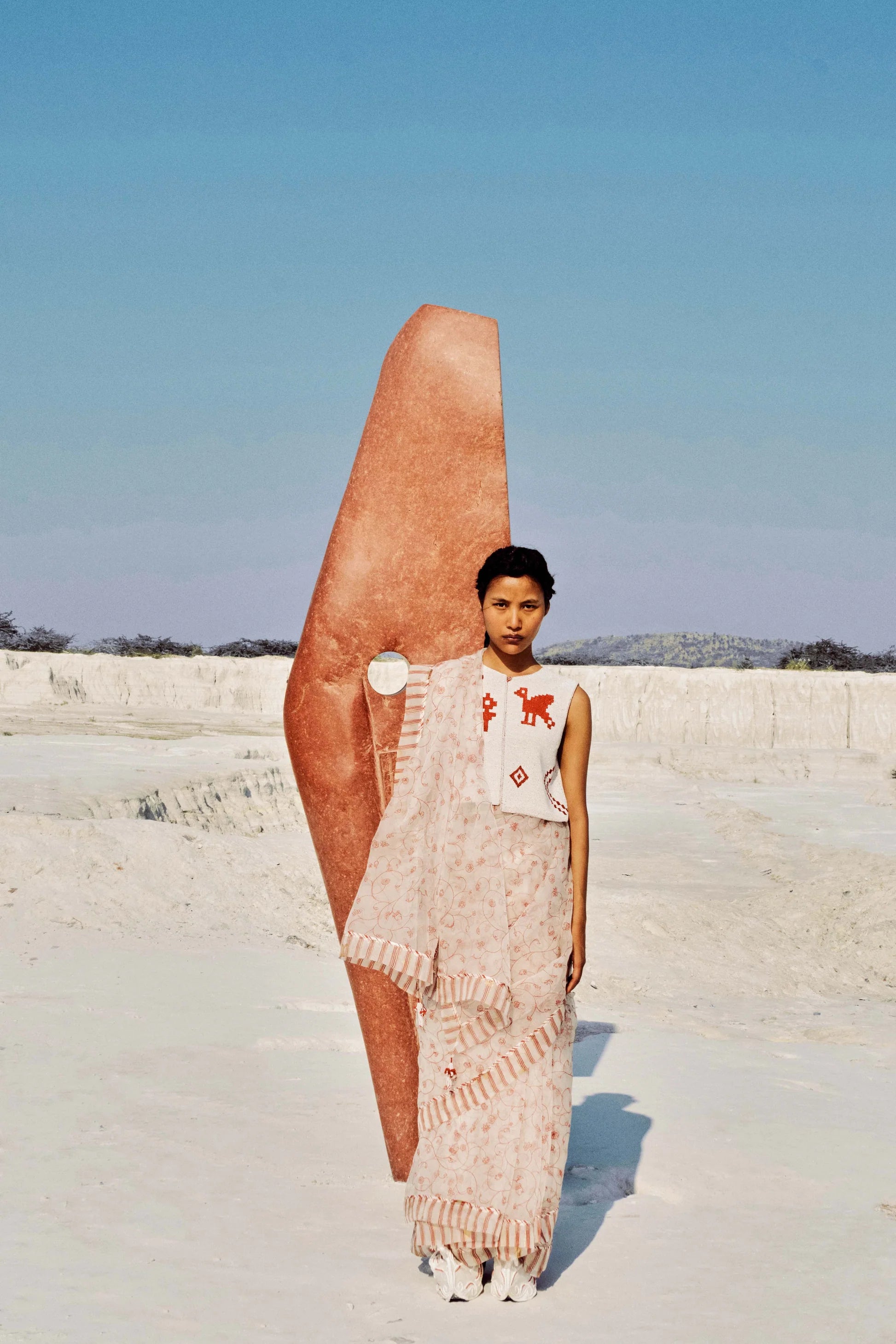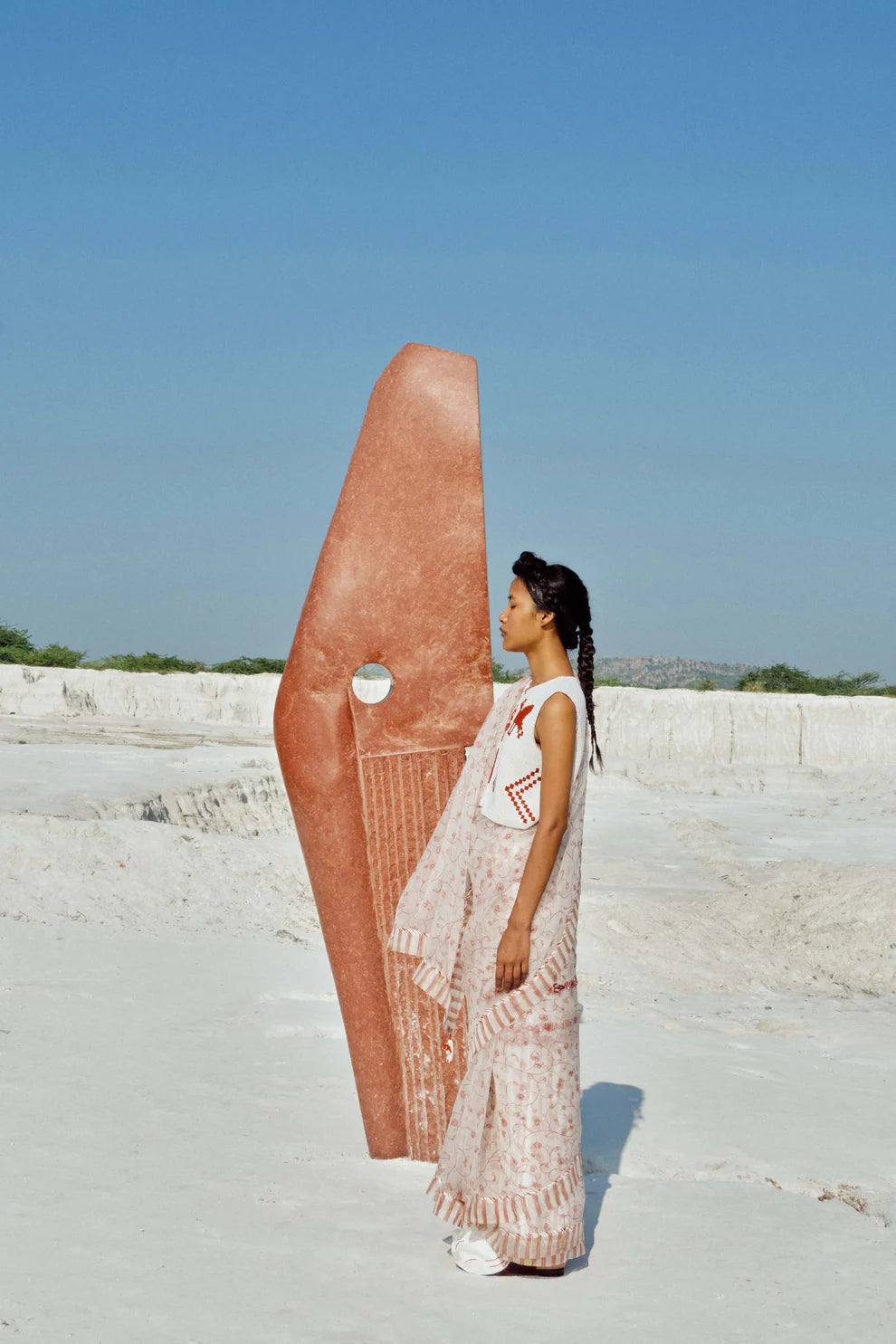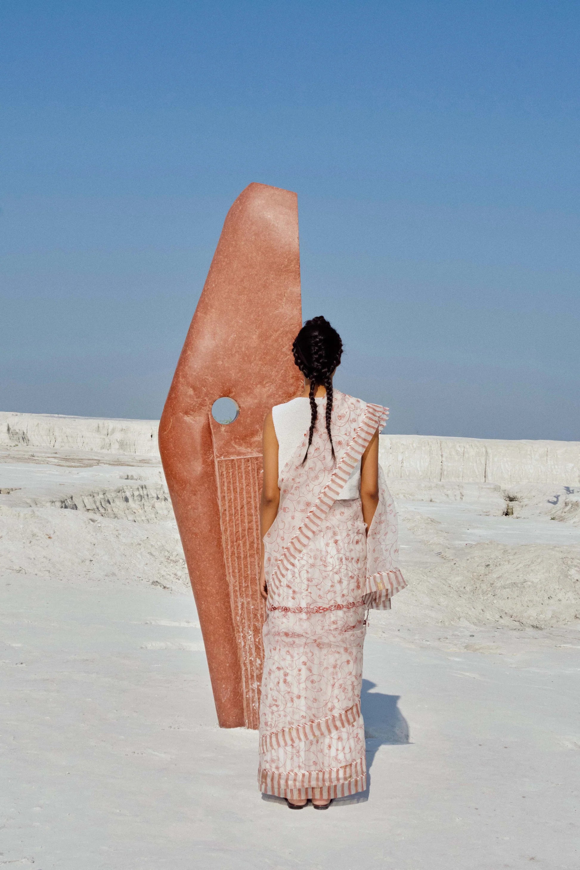 The Liz Organza Saree, crafted from hand-screen-printed silk organza, reflects an effortless blend of lightness and refined craftsmanship. Delicate lace runs gracefully along its length, while handmade beaded tassels add subtle, shimmering accents. Fine binding details trace the borders, lending gentle structure to the fluid drape of the fabric. Each lace motif, stitch, and tassel is thoughtfully executed, representing hours of skilled artisanal work. The result is a saree that embodies timeless elegance, grace, and meticulous design.
