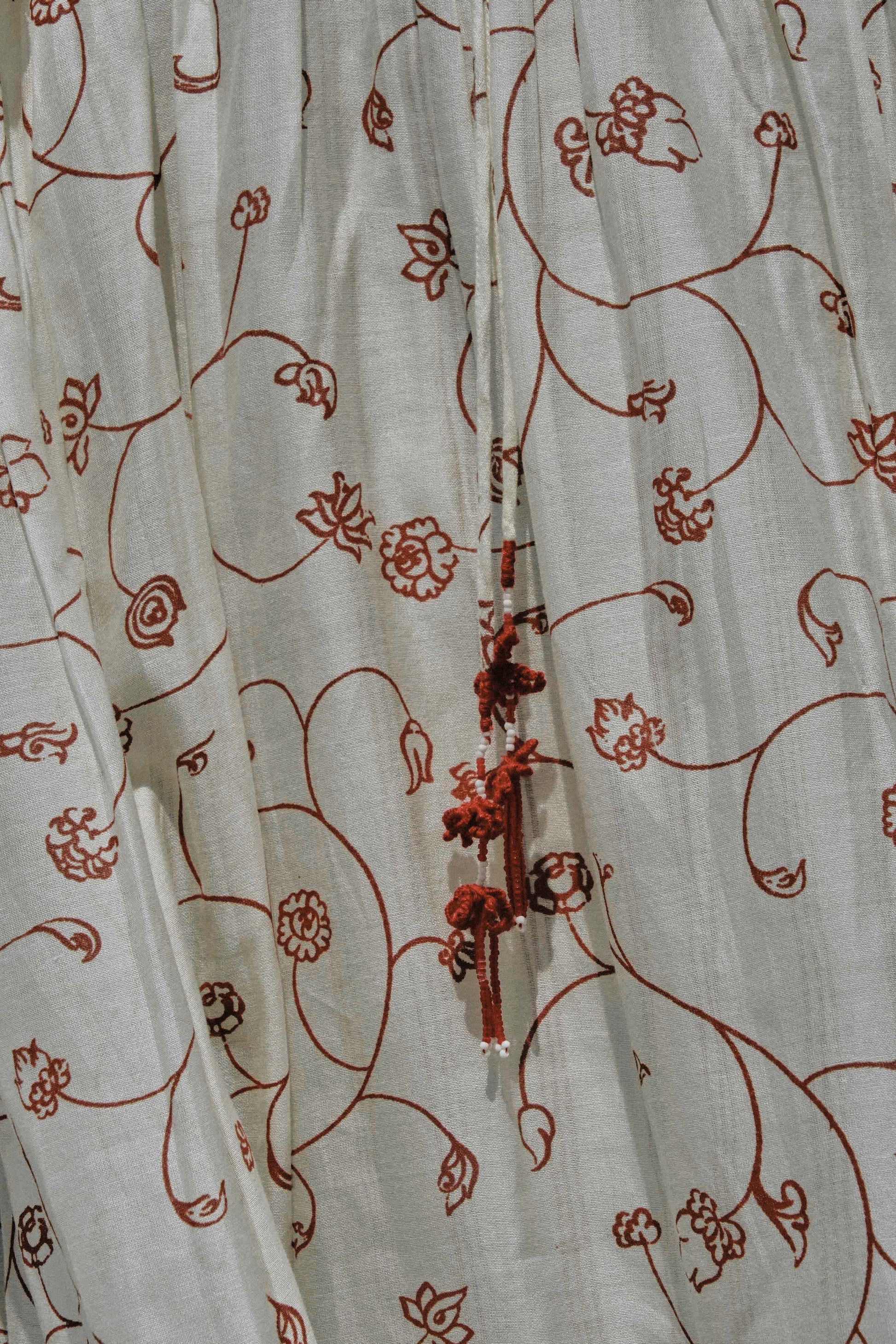 Crafted from hand-screen-printed cotton silk, the Min Maw Tier Dress brings together elegance and effortless comfort. Soft dolman sleeves create fluid movement, while gentle gathers and delicate lace details trace the silhouette with subtle charm. Tie-ups adorned with handmade beaded tassels at the front and sleeves add a playful yet refined touch, allowing for an adjustable fit. Every stitch, pleat, and embellishment reflects hours of skilled artisanal work, making this dress a versatile and sophisticated addition to any wardrobe.