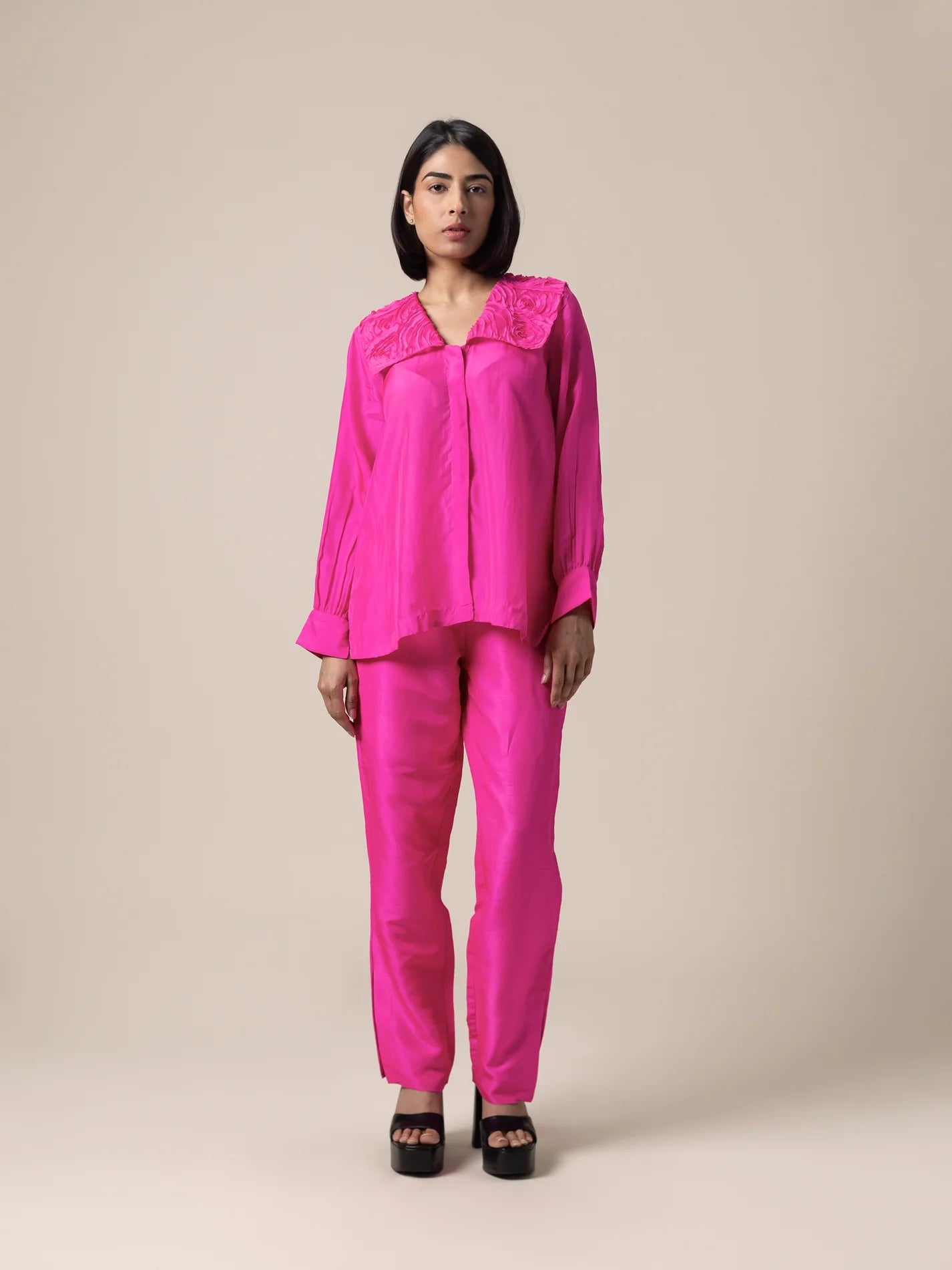 Nerissa top in hot pink silk habutai exudes an ethereal charm, highlighted by a Japanese organza collar, intricate embroidery, and delicate tonal crochet loops finished with sculpted buttons.