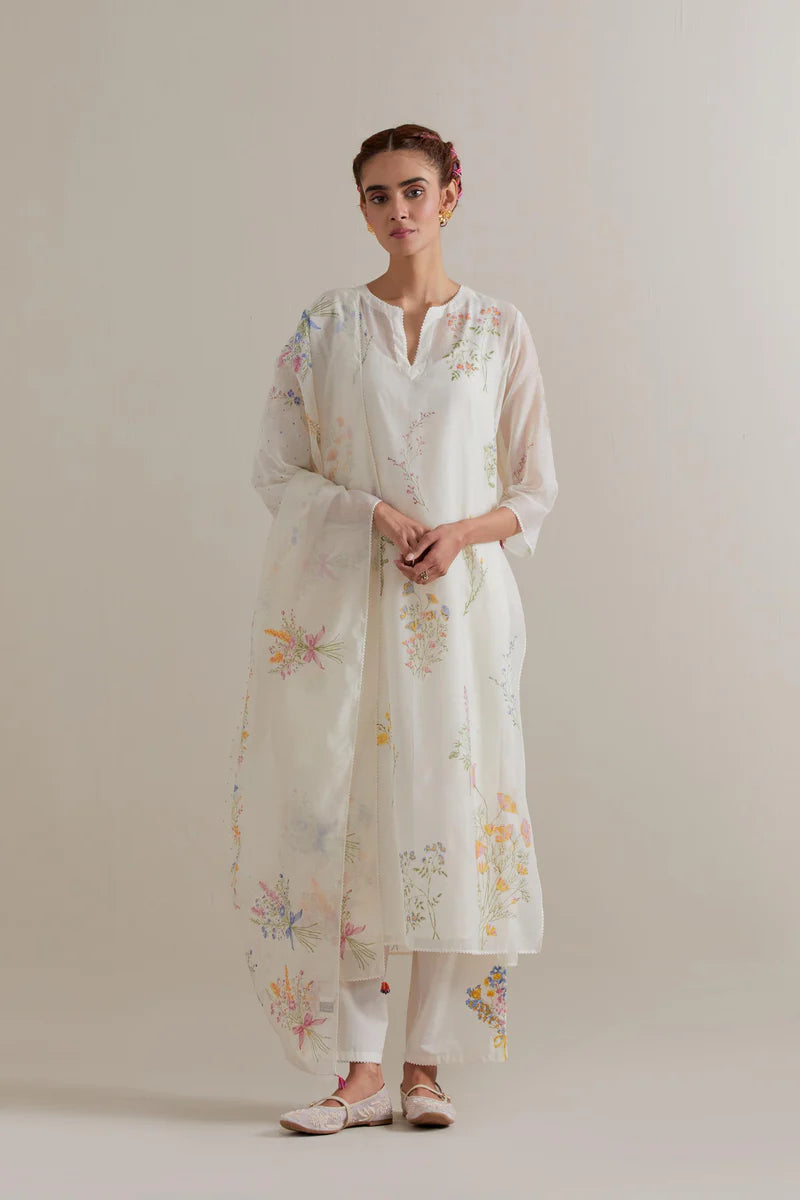 The set is complemented with an off-white cotton Chanderi dupatta adorned with all-over multicolour floral hand block print, finished with ricrac edging and delicate beaded tassels at the corners.
