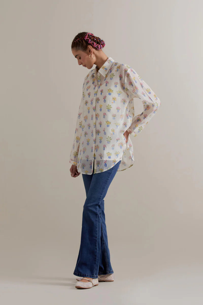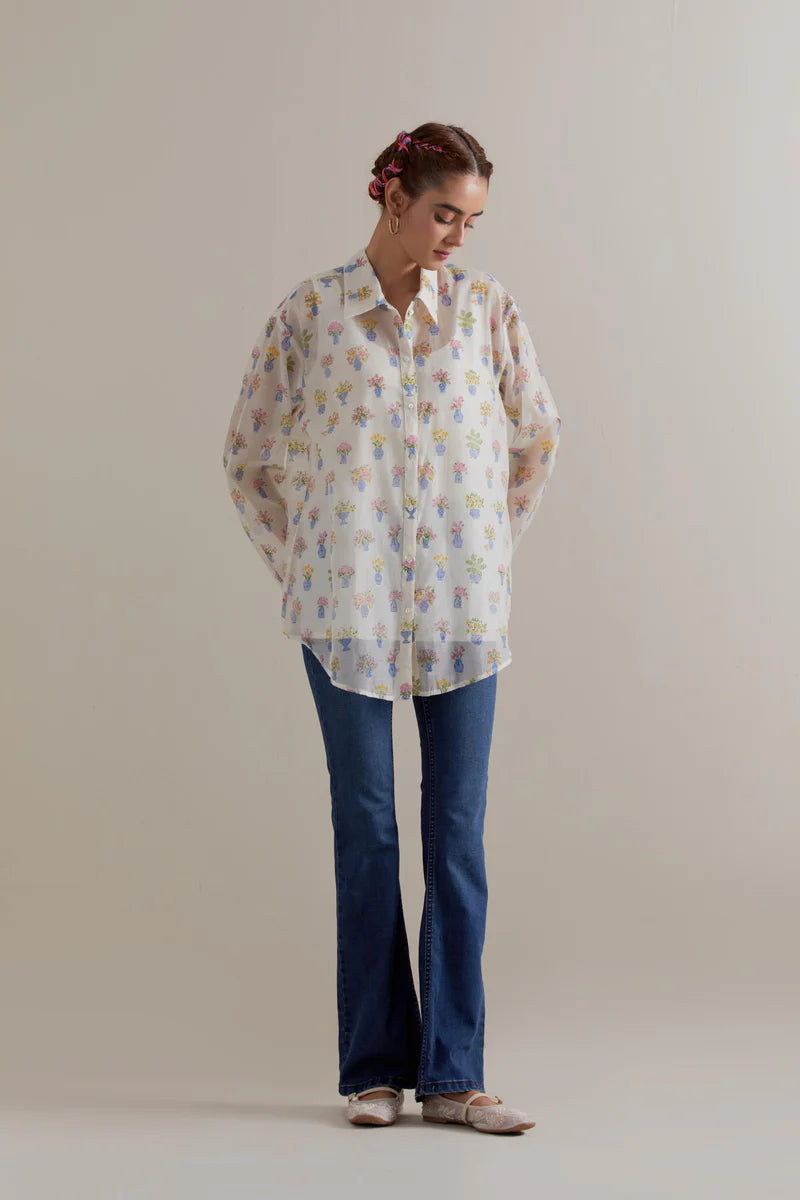 Off white cotton chanderi shirt with all-over multi coloured floral hand block print and full sleeves.