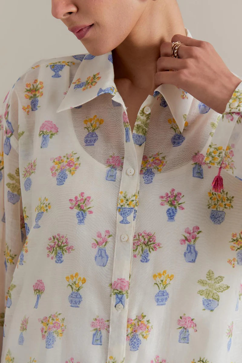 Off-white cotton chanderi shirt adorned with an all-over multicoloured floral hand block print. Designed with a classic shirt collar neckline and full sleeves, it is paired with a soft cotton slip for comfortable layering.