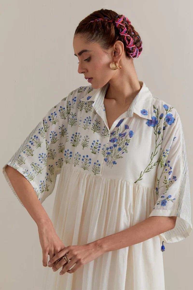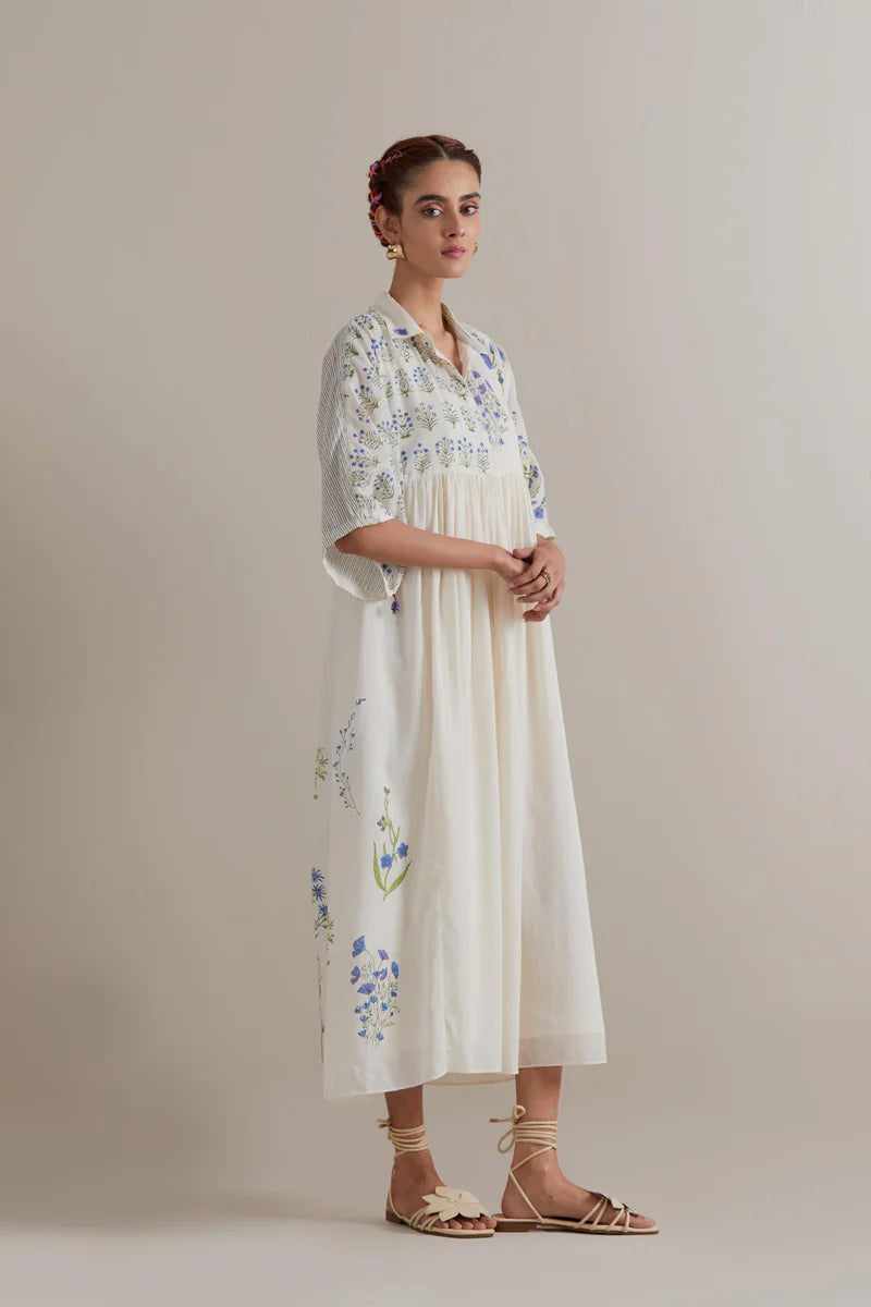 Off-white cotton dress featuring blue and green floral hand block prints, designed with soft gathers at the waist for a graceful silhouette. It has a shirt-collar neckline with a front button placket and is worn with a cotton slip for added comfort.