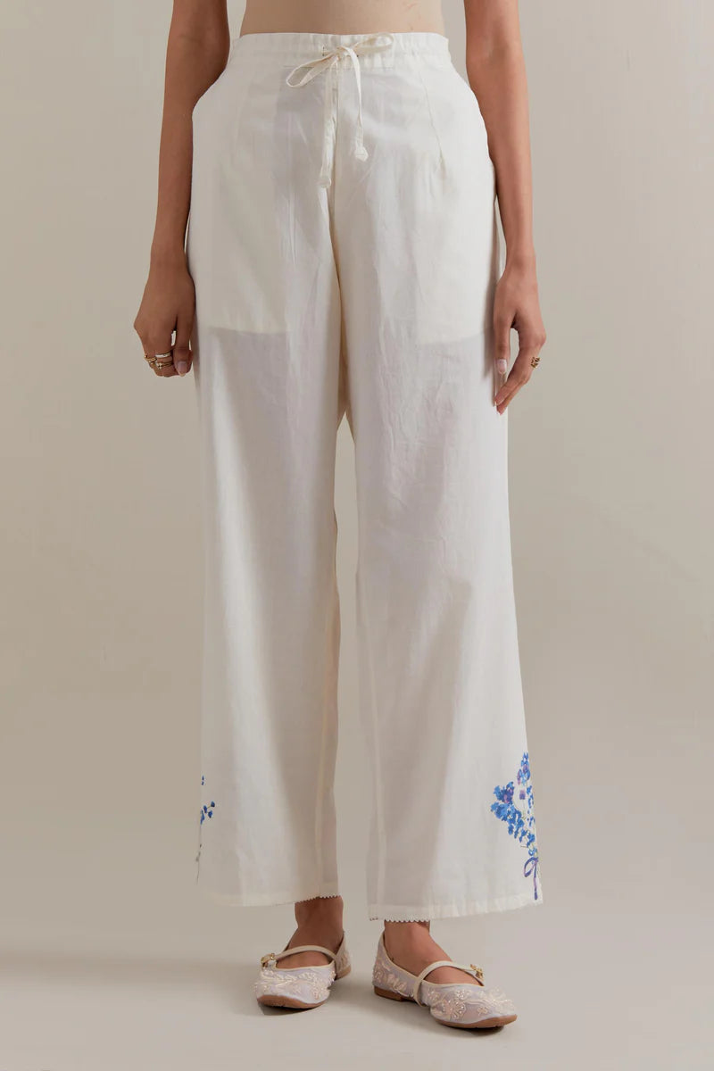 Off white cotton straight pants with Blue and green floral hand block printed boota at sides.