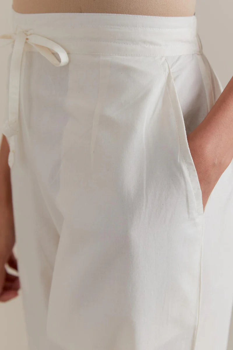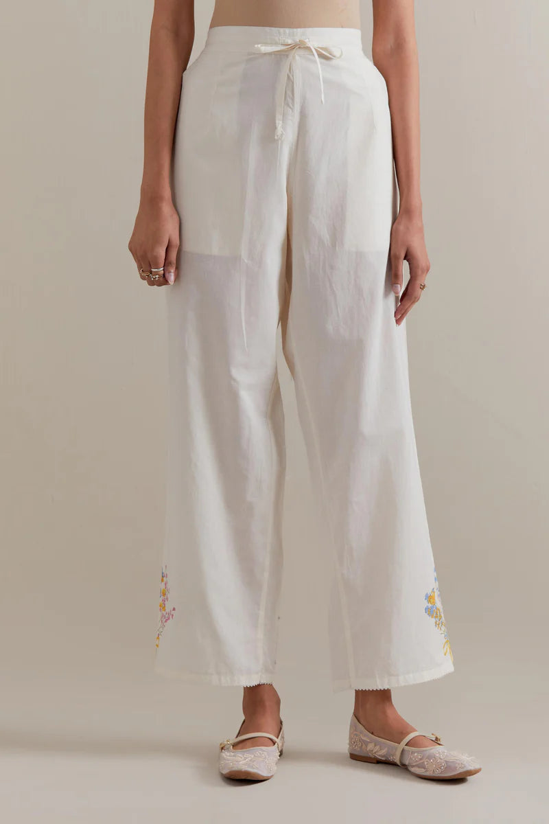 Off-white cotton straight pants featuring multicolour floral hand block printed bootas along the sides. Designed with side pockets and an elasticated waistband with front drawstrings for a comfortable, adjustable fit.