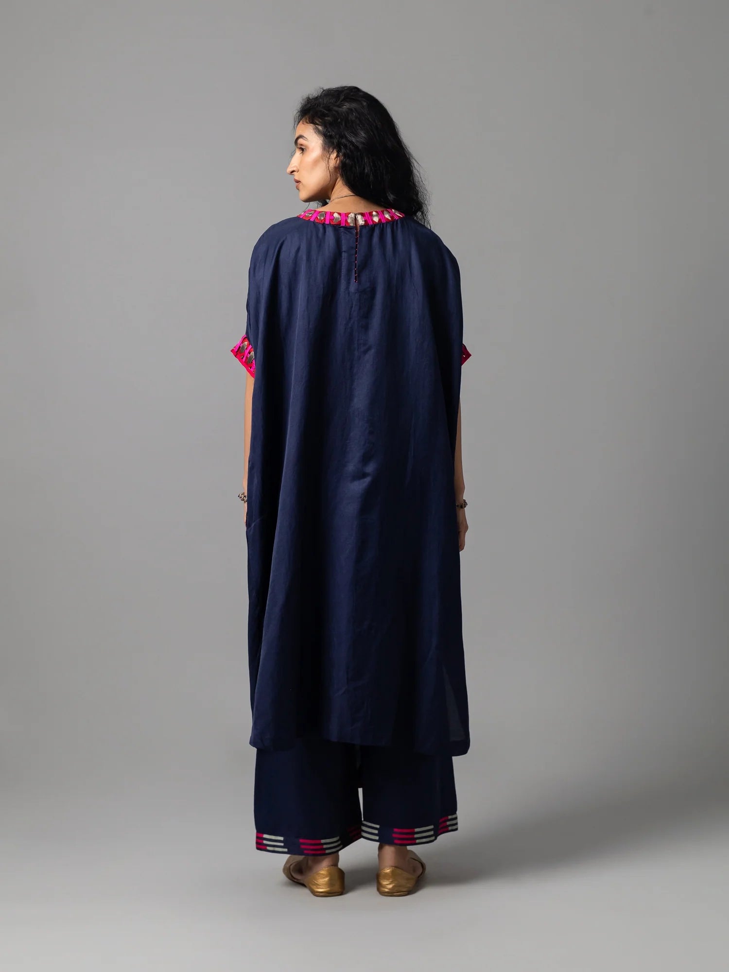 The Oxus Dress boasts a cowl silhouette with textured cuffs and collar. Bead details and rani shantoon facing add a distinctive touch to this indigo kaftan.