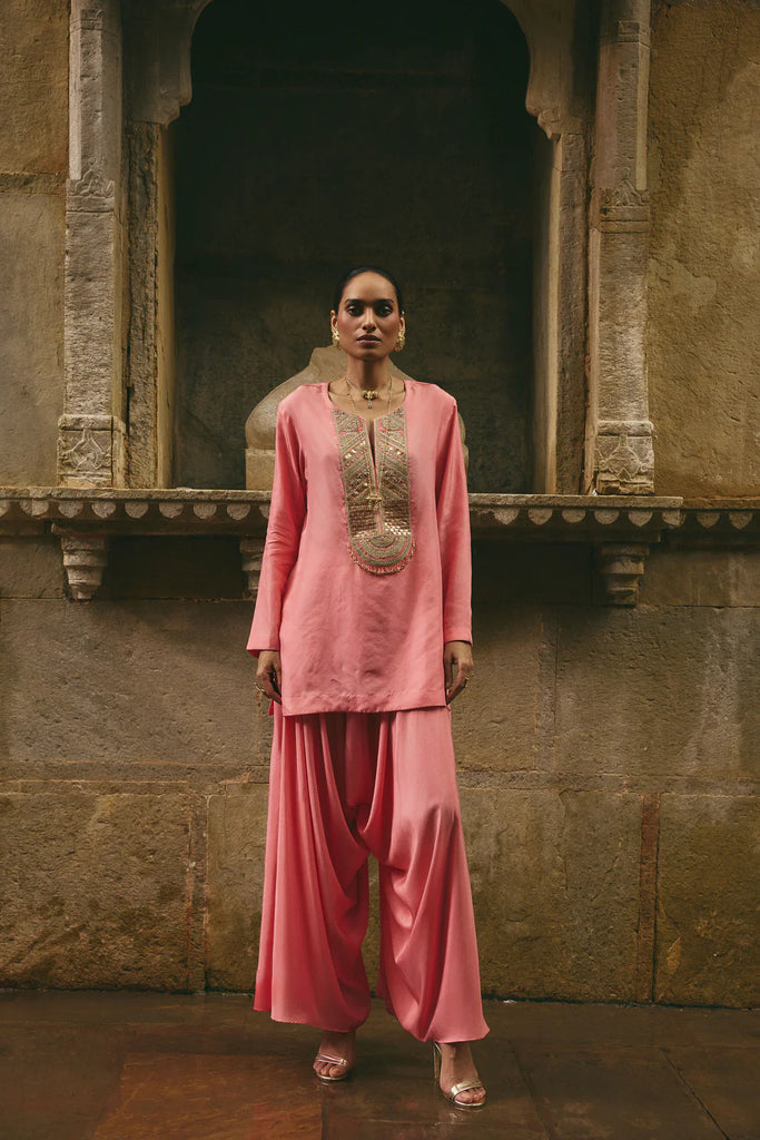 This Pink Short Kurti set features gota and dori hand embroidery on the yoke, accented with resham trims, and is paired with elegant matching Silk Dhoti Pants."